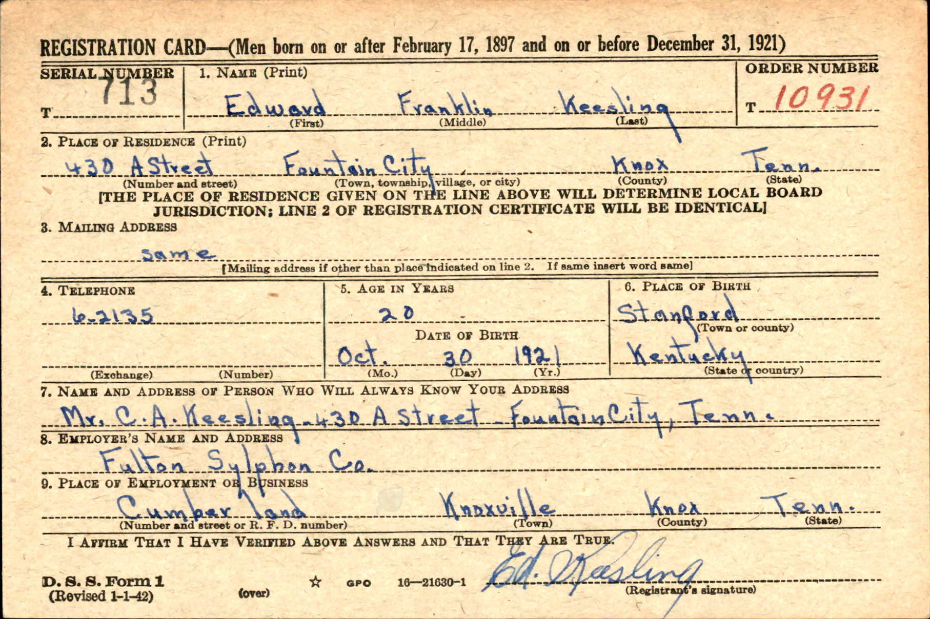 Edward Franklin Keesling was born in Stanford, Kentucky, the son of Charles Alexander Keesling and Sarah Malinda Miralce. He was the brother of Mildred, Nancy and Martha Keesling. He enlisted on August 13, 1942, in Fort Oglethorpe, GA.