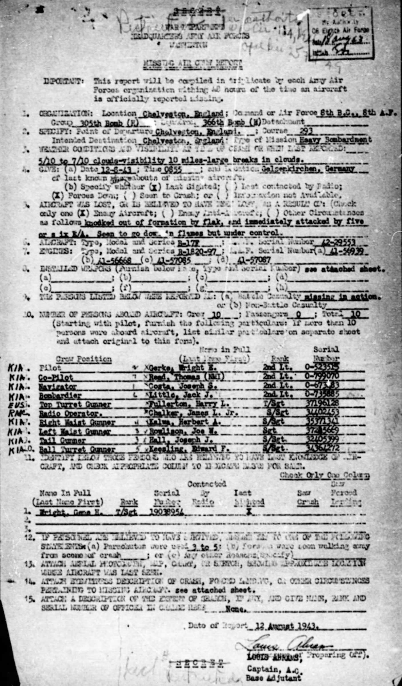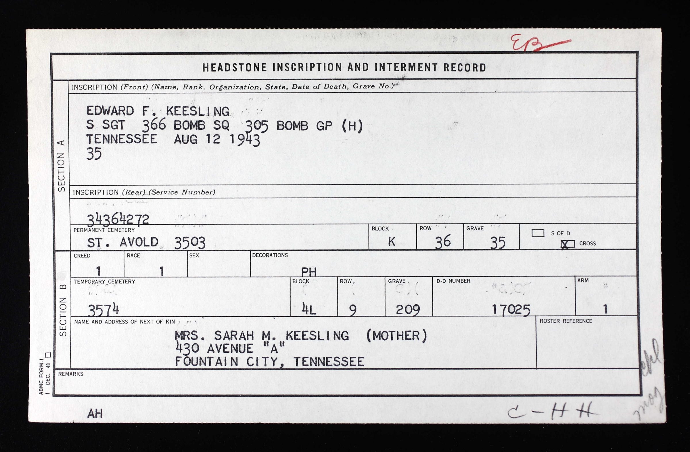 Edward Keesling was a ball turret gunner on Aircraft # 42-29553, which departed from Chelveston, England on a heavy bombing mission to Gelsenkirchen, Germany. It was hit by two large bursts of flak and by enemy fighters. The plane crashed near Muenchen-Gladbach, Germany. 8 Of the crewmembers were killed, 2 were taken prisoner of war.
