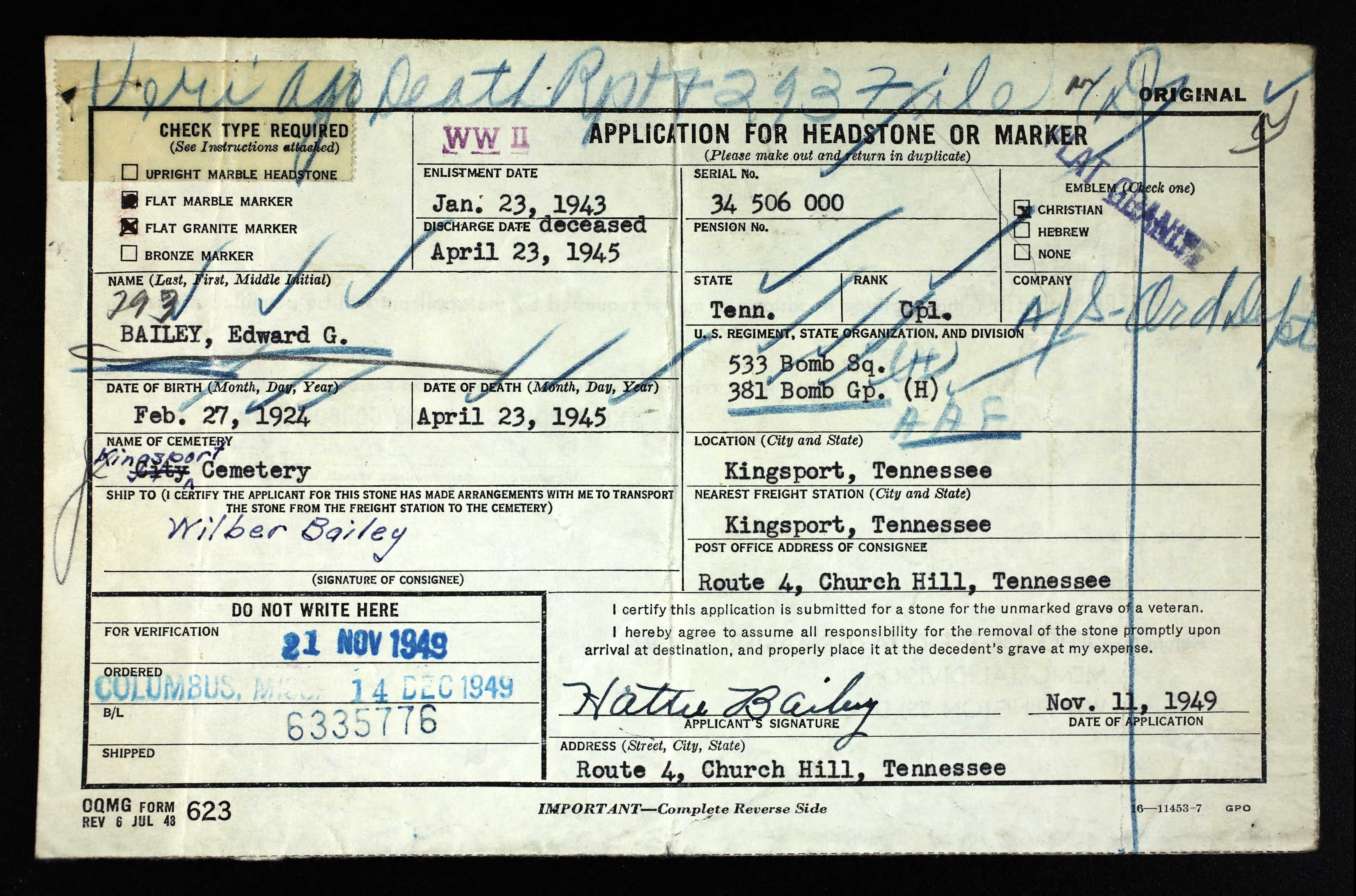 - Service Branch: Army/Army Air Forces