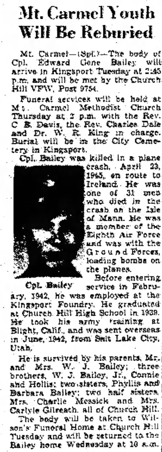 Mt. Carmel Youth will be reburied Mt-Carmel – The body of Cpl. Edward Gene Bailey will arrive in Kingsport Tuesday at 2:45 p.m. and will be met by the Church Hill VFW, Post 9754.