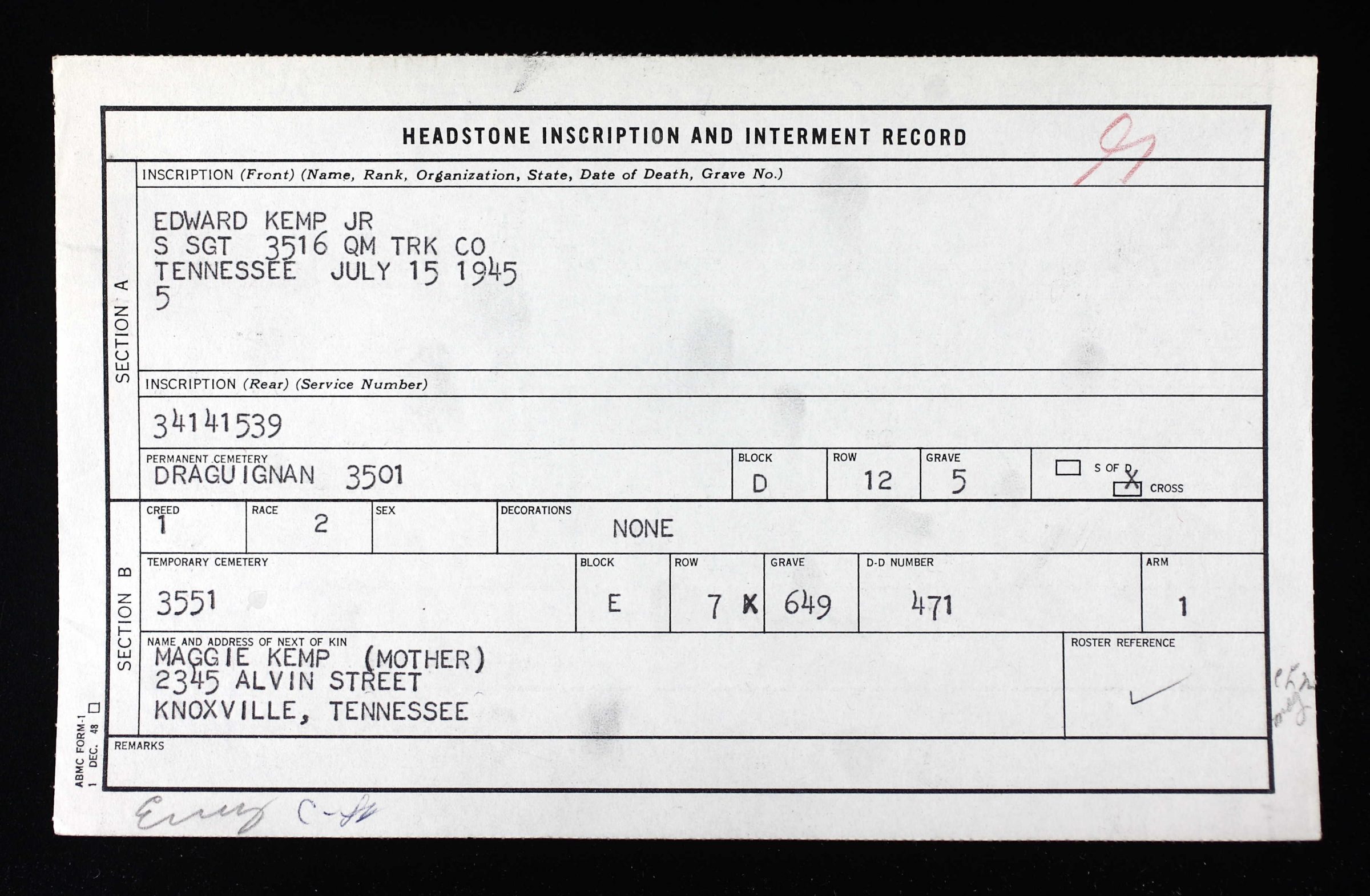 Edward Kemp was born in Knoxville, Tn. He was the son of Edward Kemp and Maggie E. Wilkerson.