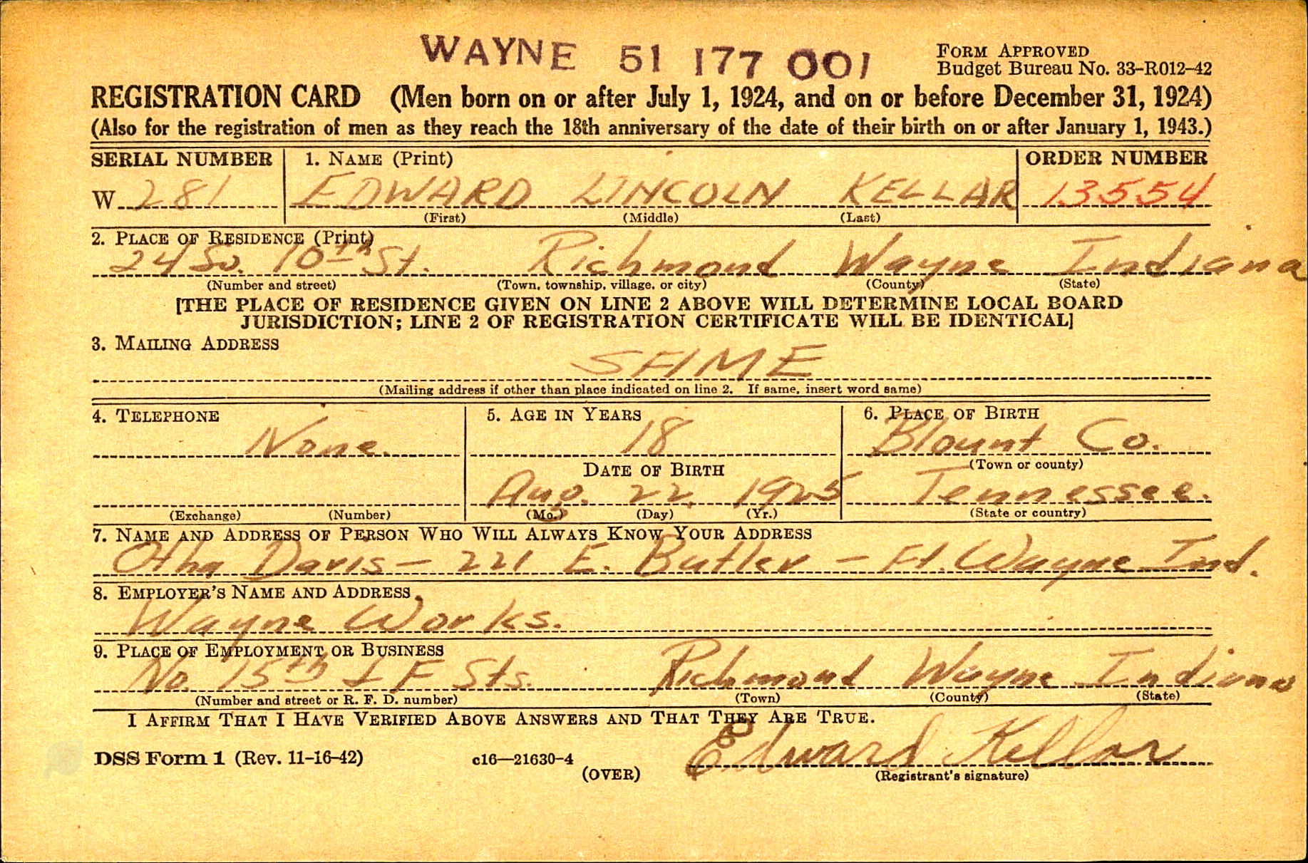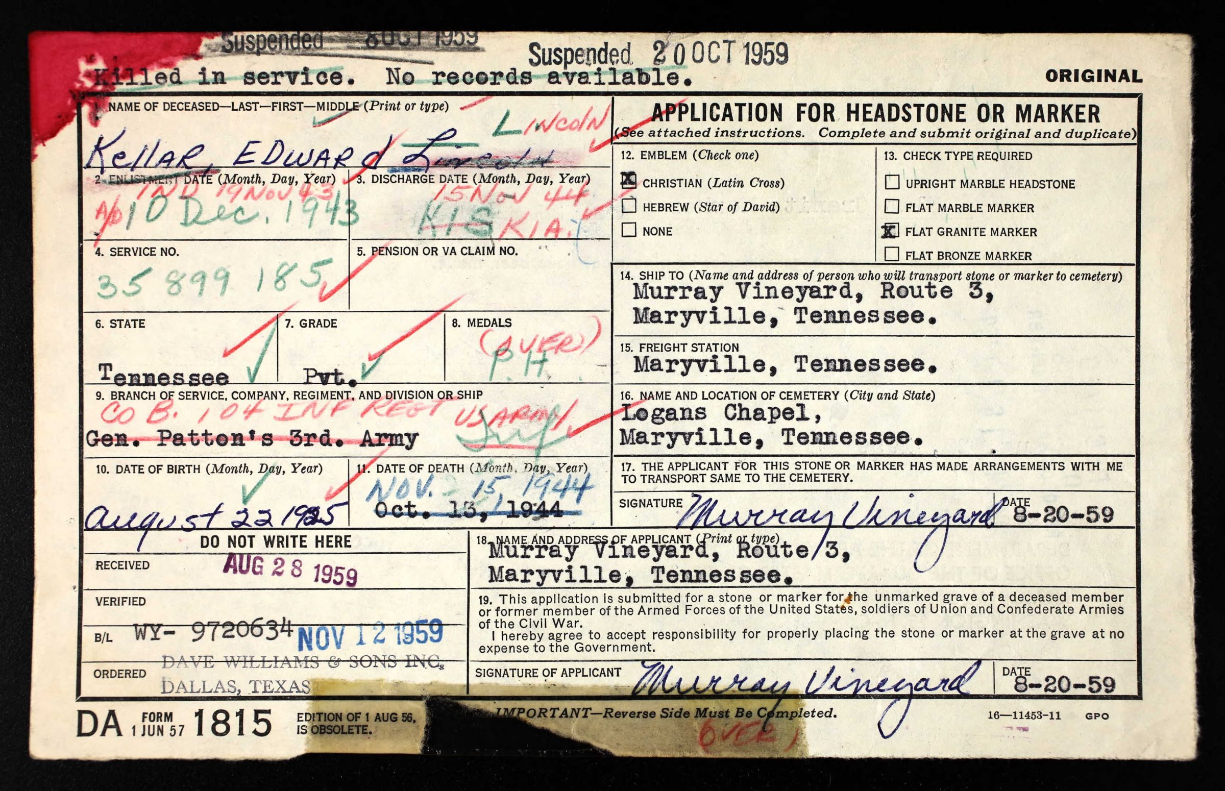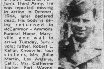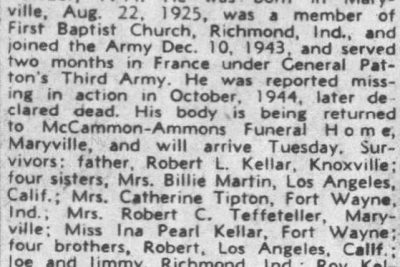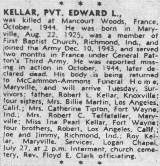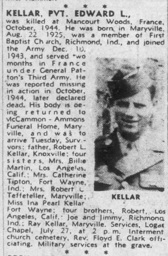 Pvt. Edward L. Kellar was killed at Mancourt Woods, France, October, 1944. He was born in Maryville, August 22, 1925, was a member of First Baptist Church, Richmond, Ind., and joined the Army Dec. 10, 1943, and served two months in France under General Patton’s Third Army. He was reported missing in action in October, 1944, later declared dead. His body is being returned to McCammon-Ammons Funeral Home, Maryville. Survivors; father, Robert L. Kellar, Knoxville; four sisters, Mrs. Billie Martin, Los Angeles, Calif.; Mrs. Catherine Tipton, Fort Wayne, Ind.; Mrs. Robert C. Teffeteller, Maryville; Miss Ina Pearl Kellar, Fort Wayne; four brothers, Robert, Los Angeles, Calif.; Joe and Jimmy, Richmond, Ind.; Roy Kellar, Maryville.