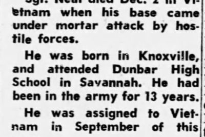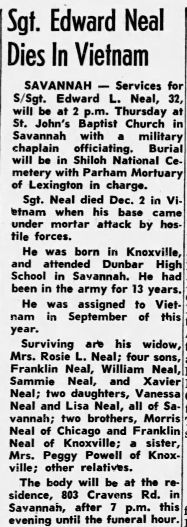 Services for S/Sgt. Edward L. Neal, 32, will be at St. John’s Baptist Church in Savannah with a military chaplain officiating. Burial will be in Shiloh National Cemetery. Sgt. Neal died Dec. 2 in Vietnam when his base came under mortar attack by hostile forces. He was born in Knoxville and attended Dunbar High School in Savannah. He had been in the army for 13 years. He was assigned to Vietnam in September of this year.