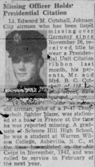 Lt. Edward M. Cutshall, Johnson City airman who has been listed missing over Germany since November 26, received title to wear a Presidential Unit Citation ribbon last month, his parents, Mr. and Mrs. B.C. Cutshall of 116 Legion street have learned. Lt. Cutshall, pilot of a P-47 Thunderbolt fighter plane, was stationed at a base in France at the time he was reported missing. A graduate of Science Hill High School, he was a student at Warren Wilson College, Asheville, N.C., at the time he enlisted in the Air Corps in November, 1942, and was called to service in February of the next year.