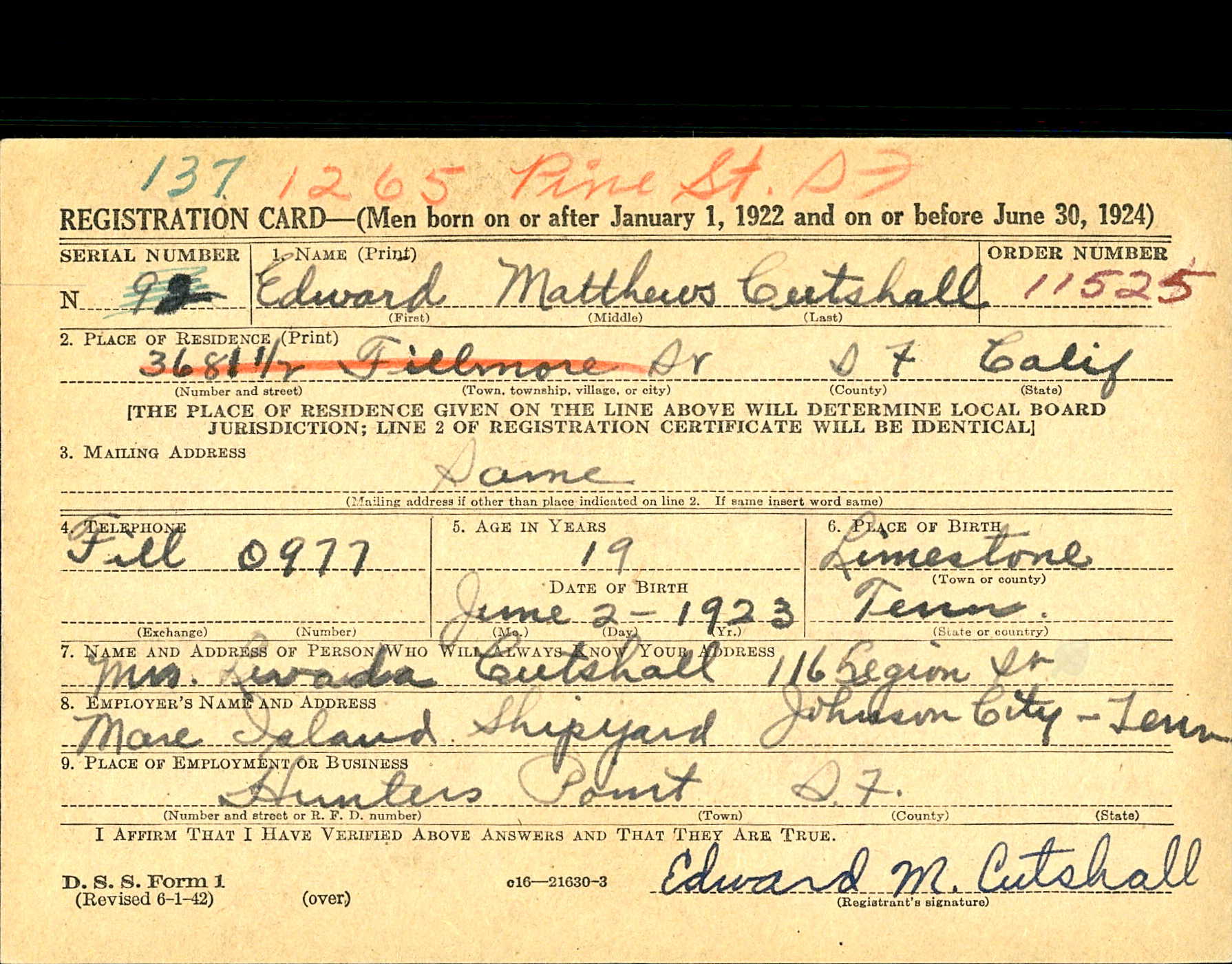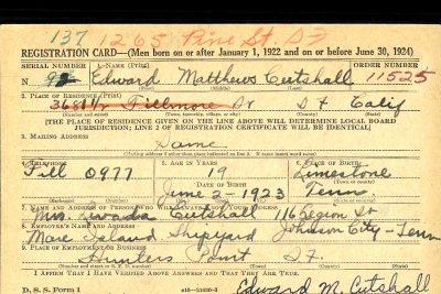 Edward Matthews Cutshall was born on 2 June 1923 in Limestone, Tennessee, the son of Bartley Chester Cutshall and Lovada Shelton. His brother, James J. Cutshall served with the Marine Corps during World War II and his brother Jack Forest Cutshall with the US Navy.