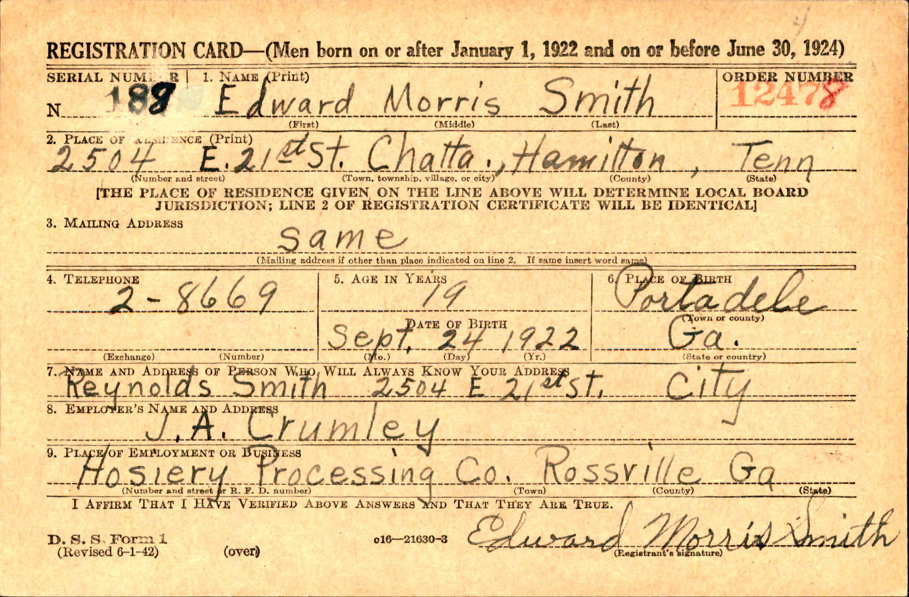 Edward Morris Smith was born in Portadele, Georgia, son of Richard Reynolds Smith and Jennie Hornbuckle. He was a former employe of the Hosiery Processing Company.