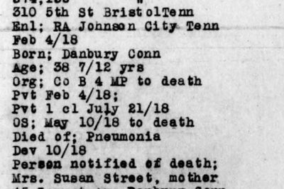 He served with the Company B, 4th Division M.P. A.E.T. and died of pneumonia in Danbury, Connecticut.