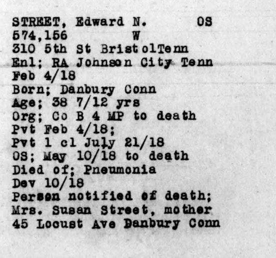 Edward Nathaniel Street was born in Danbury, Connecticut, son of Nathaniel and Susan Street. He joined the Army at the age of 39.