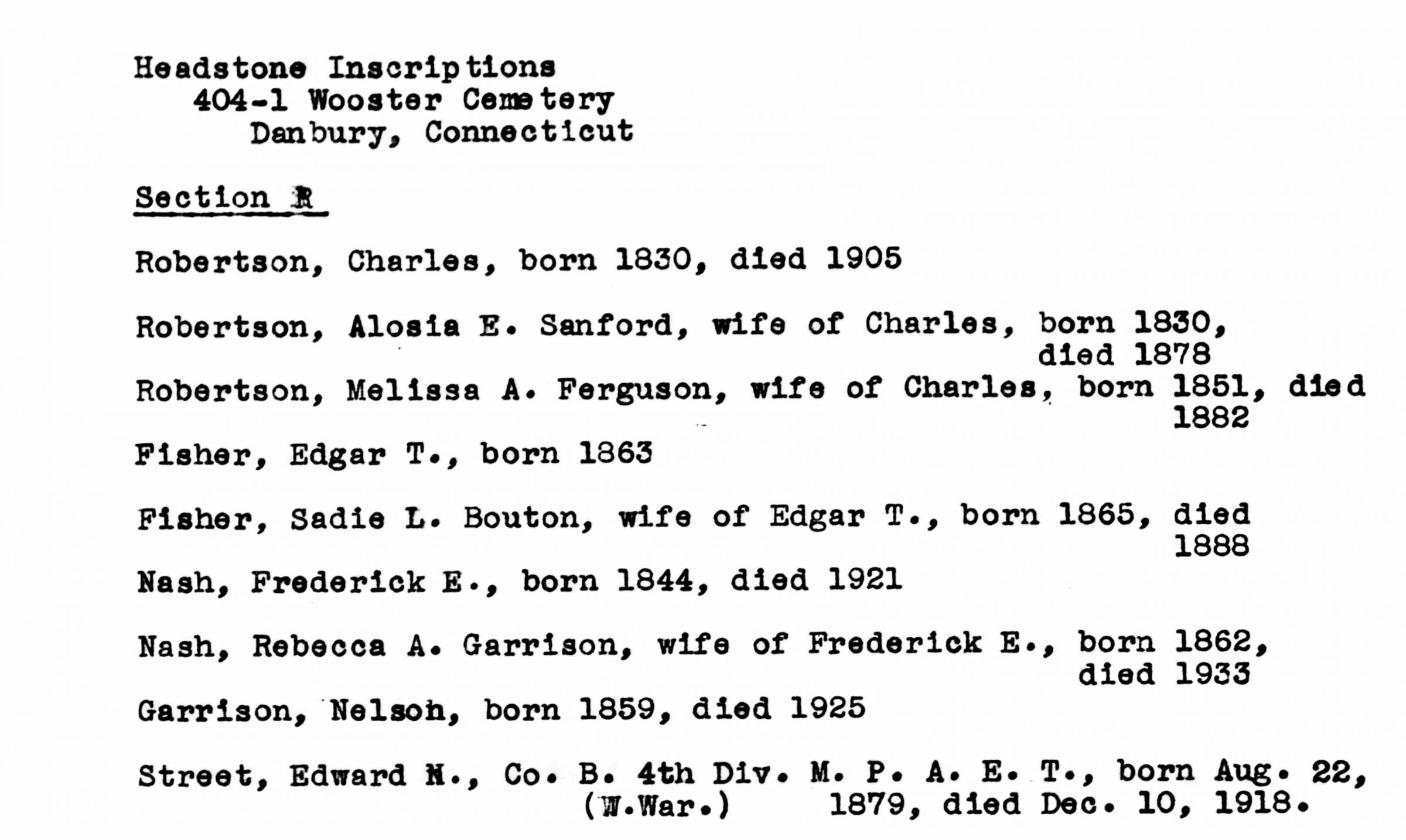 - Burial/Memorial Location: Wooster Cemetery, Danbury, Fairfield County, Connecticut