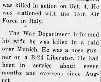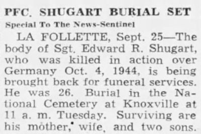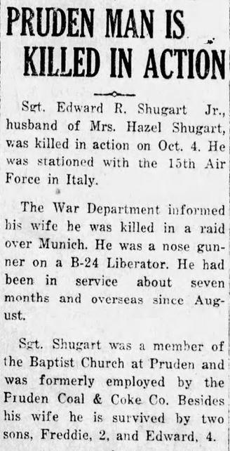Sgt. Edward R. Shugart Jr., husband of Mrs. Hazel Shugart, was killed in action on Oct. 4. He was stationed with the 15th Air Force in Italy. The War Department informed his wife he was killed in a raid over Munich. He was a nose gunner on a B-24 Liberator. He had been in service about seven months and overseas since August. Sgt. Shugart was a member of the Baptist Church at Pruden and was formerly employed by the Pruden Coal & Coke Co. Besides his wife he is survived by two sons, Freddie, 2 and Edward, 4.