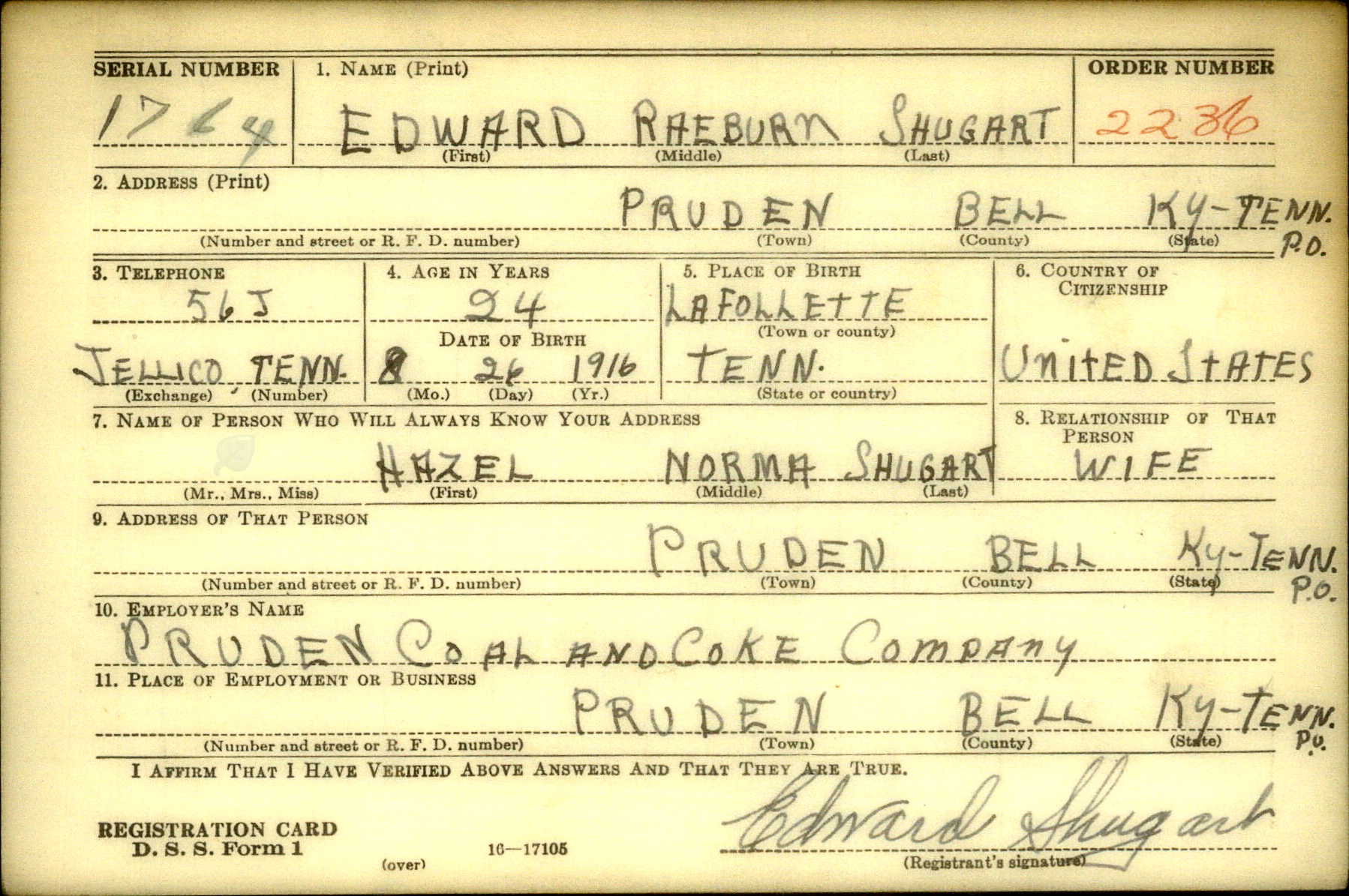 Edward Raeburn Shugart was born on 26 August 1917 in LaFollette, Tennessee, the son of Edward Raymond Shugart and Katherine May Farmer. He was married to Hazel Norma Hill and father of Edward Raeburn Shugart III and Freddie Shugart.