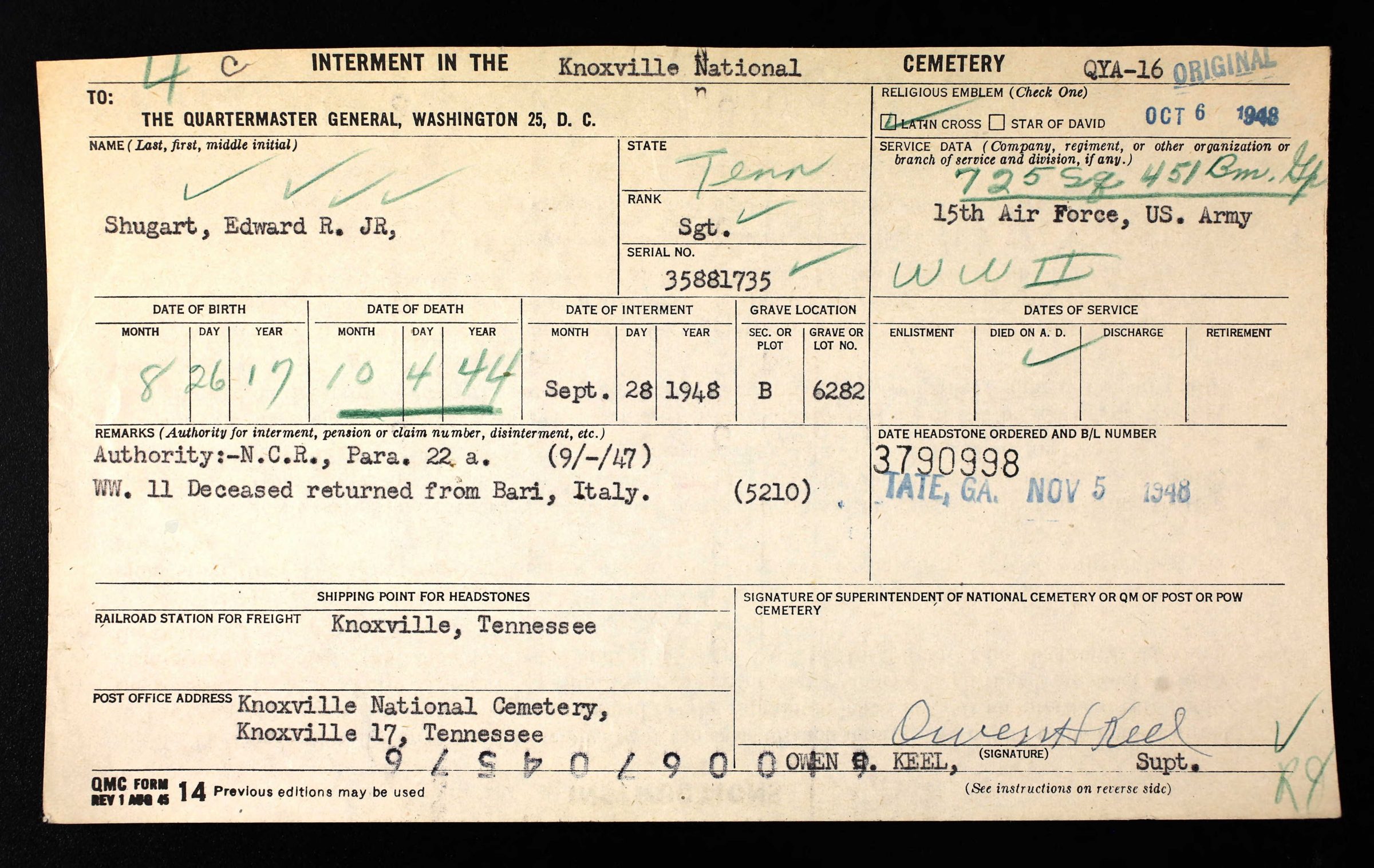 Sgt Shugart was returned from Bari, Italy. He is buried at the Knoxville National Cemetery, B, 6282.