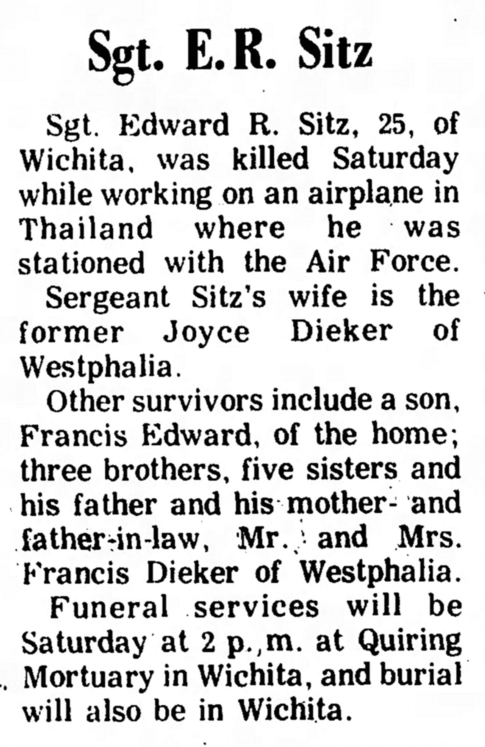 Edward Ray Sitz was killed while working on an airplane in Thailand where he was stationed with the Air Force. He was married to the former Joyce Dieker and father of Francis Edward Sitz. He was a 1966 graduate of Marion County High School and was stationed at McConnell Air Force Base in Wichita in 1971.