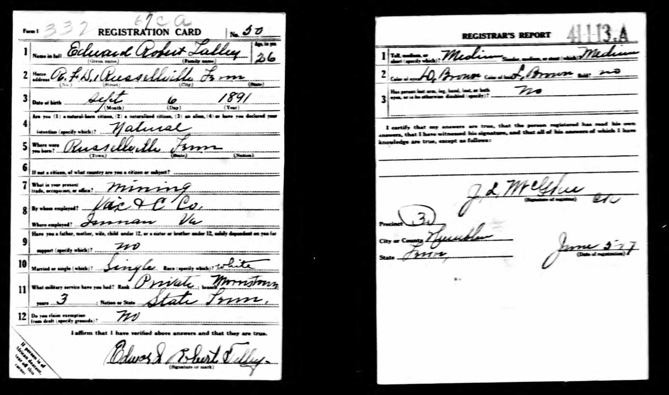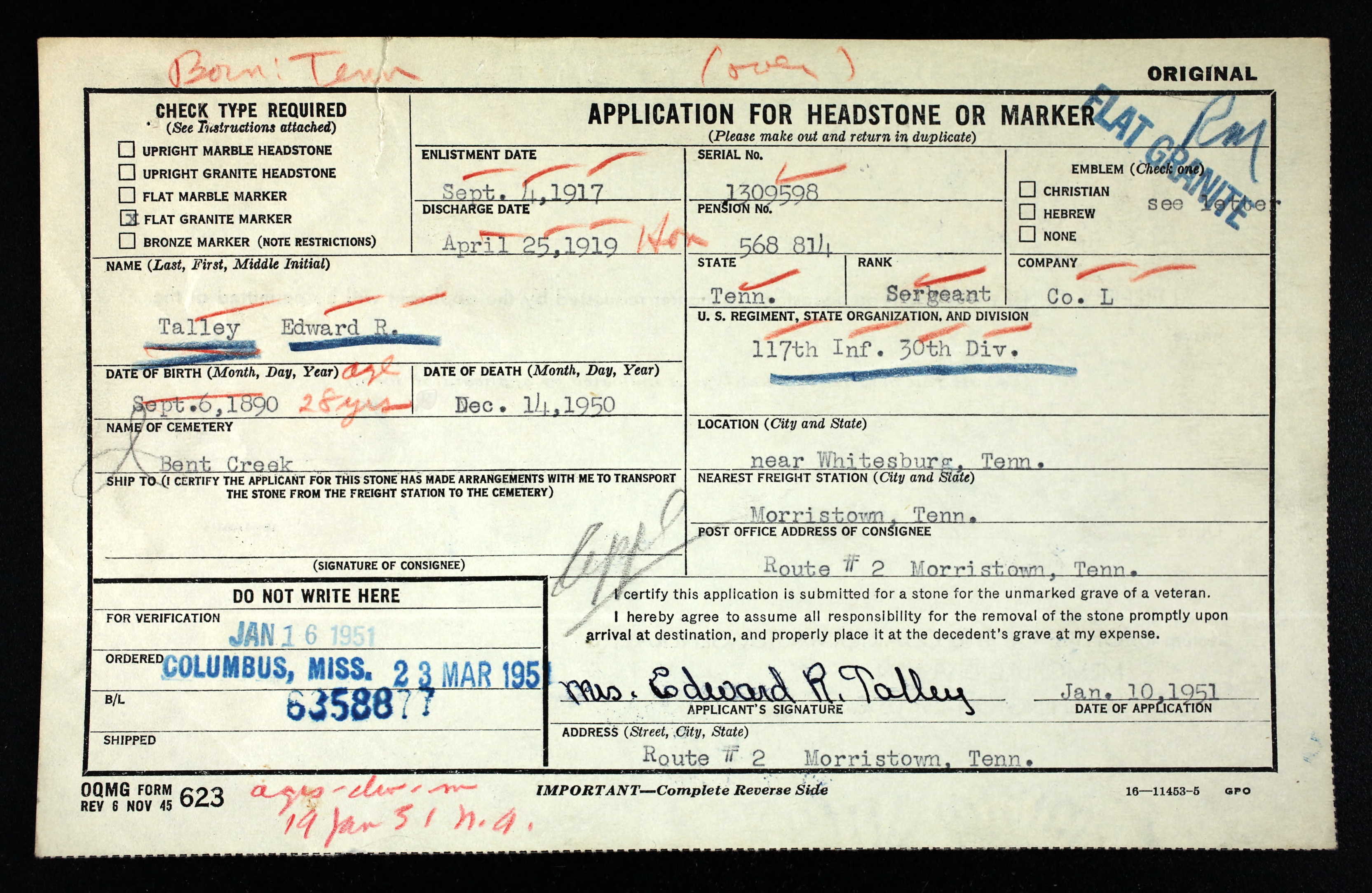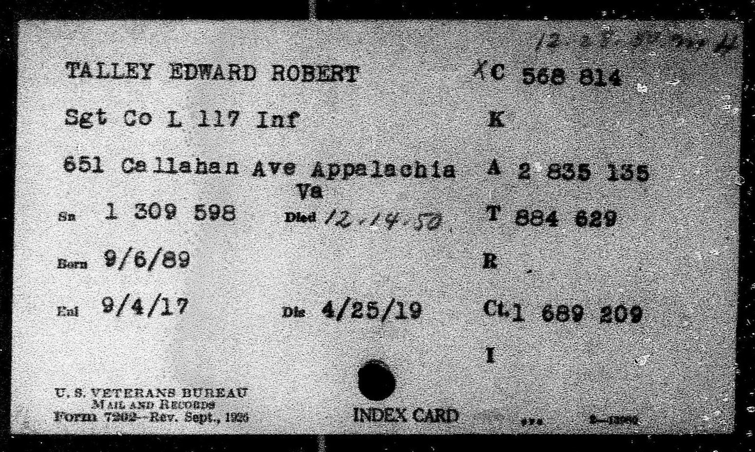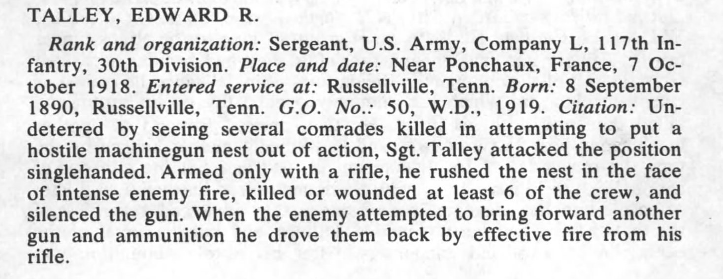 Undeterred by seeing several comrades killed in attempting to put a hostile machinegun nest out of action, Sgt. Talley attacked the position single-handed. Armed only with a rifle, he rushed the nest in the face of intense enemy fire, killed or wounded at least 6 of the crew, and silenced the gun. When the enemy attempted to bring forward another gun and ammunition he drove them back by effective fire from his rifle.”