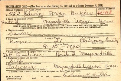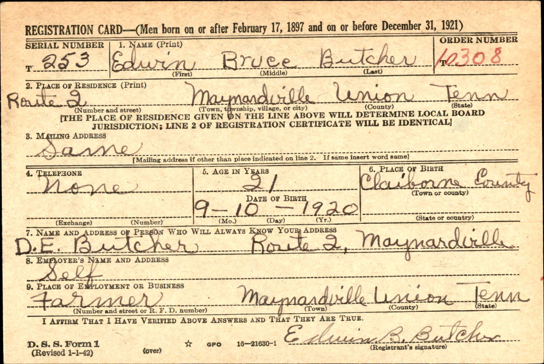 Edwin Bruce Butcher was born September 10, 1920 in Union County, Tennessee. He was the son of David Elmer Butcher and Lou Verna Perry Butcher. He was married to Sara Beatrice Lamb.