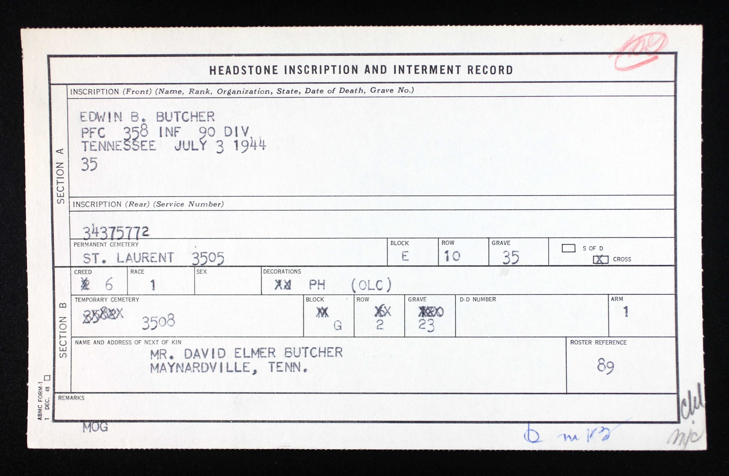 Private First Class Butcher was killed in action on July 3, 1944 in Normandy, France. He is buried at Normandy American Cemetery in Colleville-sur-Mer, France.