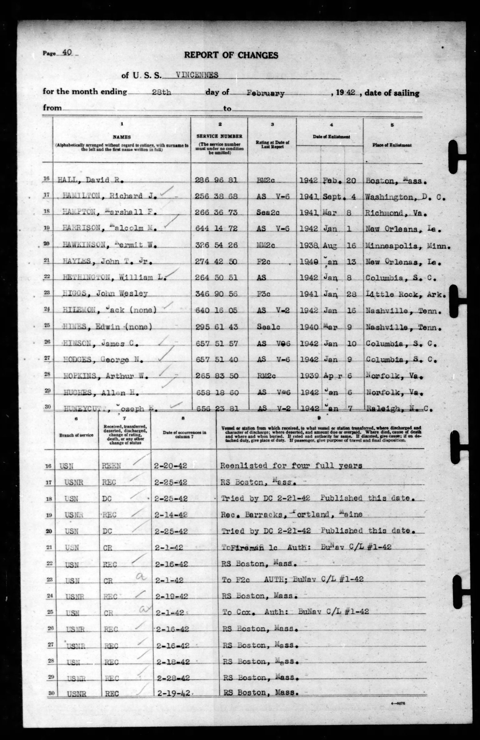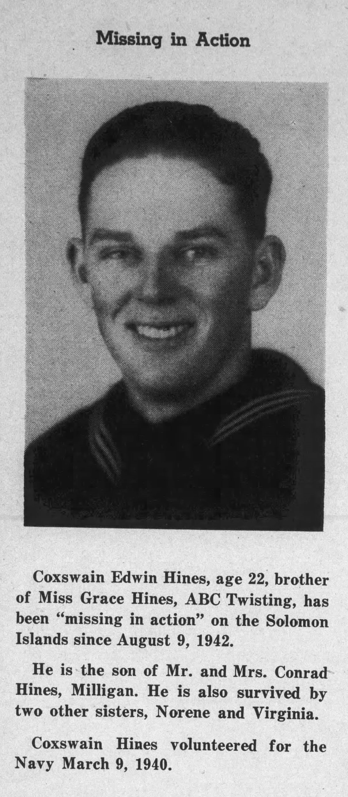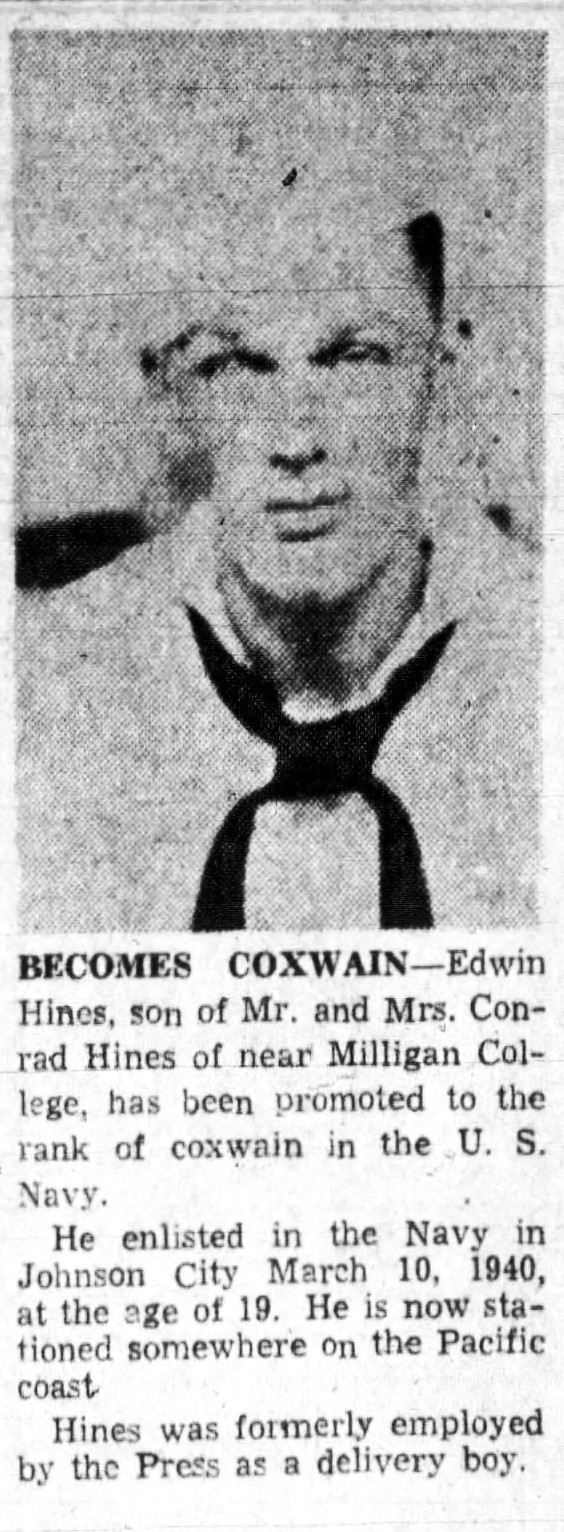 Seaman First Class Edwin Hines was promoted to Cox on 1 February 1942. He Served on the U.S.S. Vincennes.