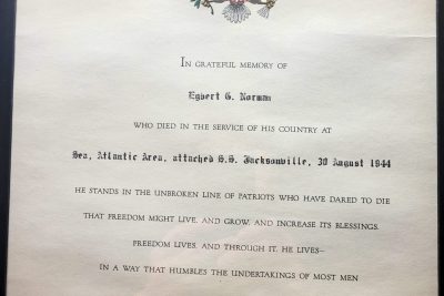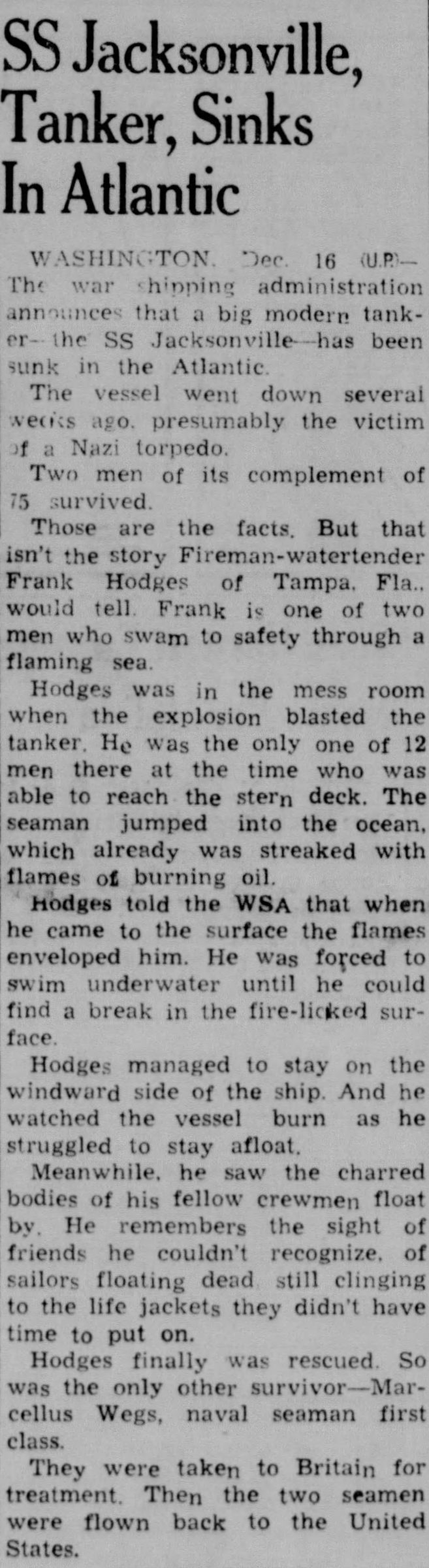 Seaman Norman was a member of the Naval Armed Guard shipped aboard the tanker Jacksonville. While in convoy in the northeast Atlantic, the Jacksonville was torpedoed and sunk. KIA Crew 48, AG 30. Five Tennesseans lost their life in this sinking.