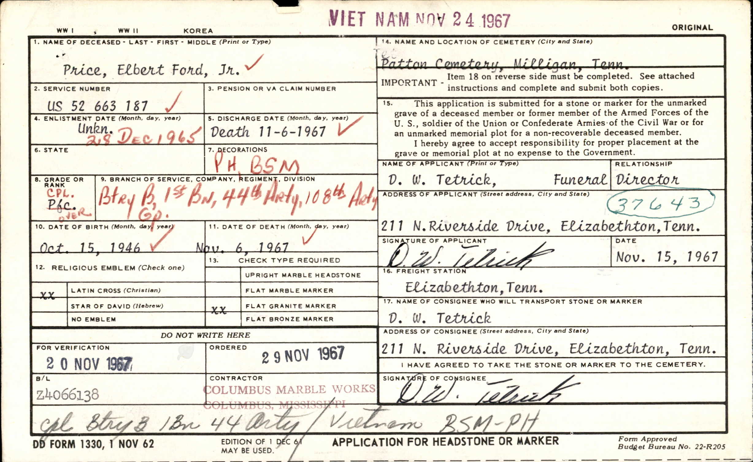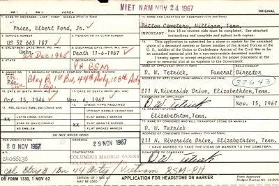 Corporal Elbert Ford Price, Jr. was born on October 15, 1946, and was originally from Grafton, Ohio, and was later a resident of Watauga, Tennessee. He served his country in the Vietnam War in the United States Army, as an automatic weapons crewman in B Battery, 1st Battalion, 44th Artillery, 108th Artillery Group. His tour in Vietnam began on February 13, 1967. Later that year, on November 6, 1967, Cpl. Price was killed from mortar fire under hostile conditions in Quang Tri province, South Vietnam; he was 21 years old at the time of his death. Cpl. Price is memorialized on the Vietnam Veterans Memorial, Panel 29E, Line 34.