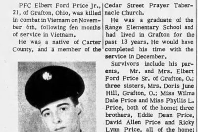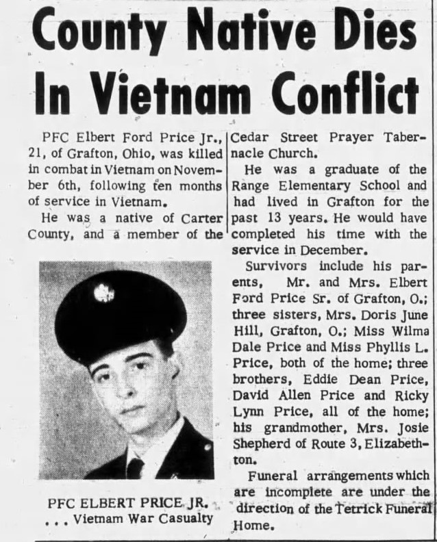PFC Elbert Ford Price Jr., 21, of Grafton, Ohio, was killed in combat in Vietnam on November 6th, following then months of service in Vietnam. He was a native of Carter County, and a member of the Cedar Street Prayer Tabernacle Church. He was a graduate of the Range Elementary School and had live in Grafton for the past 13 years. He would have completed his time with the service in December. Survivors include his parents, Mr. and Mrs. Elbert Ford Price Sr. of Grafton, O.; three sisters, Mrs. Doris June Hill, Grafton, O., Miss Wilma Dale Price and Miss Phyllis L. Price, both of the home; three brothers, Eddie Dean Price, David Allen Price and Ricky Lynn Price, all of the home; his grandmother, Mrs. Josie Shepherd of Route 3, Elizabethton.