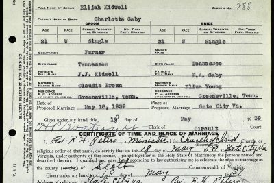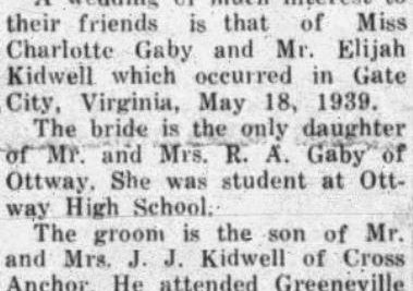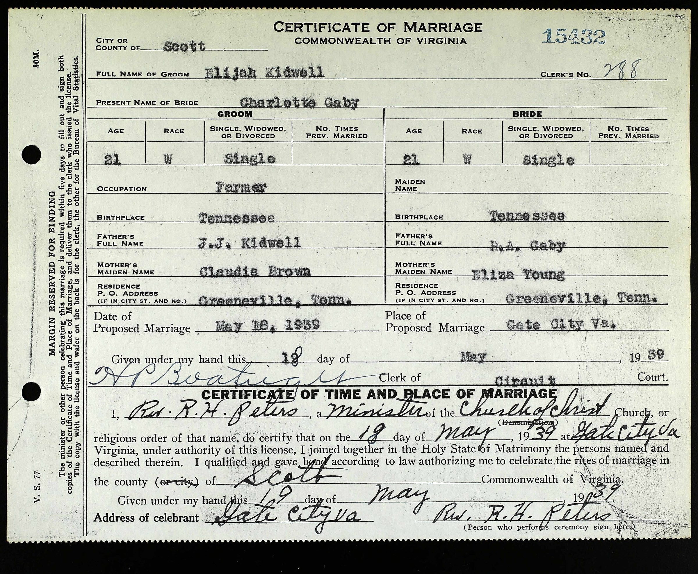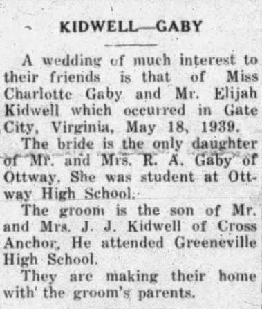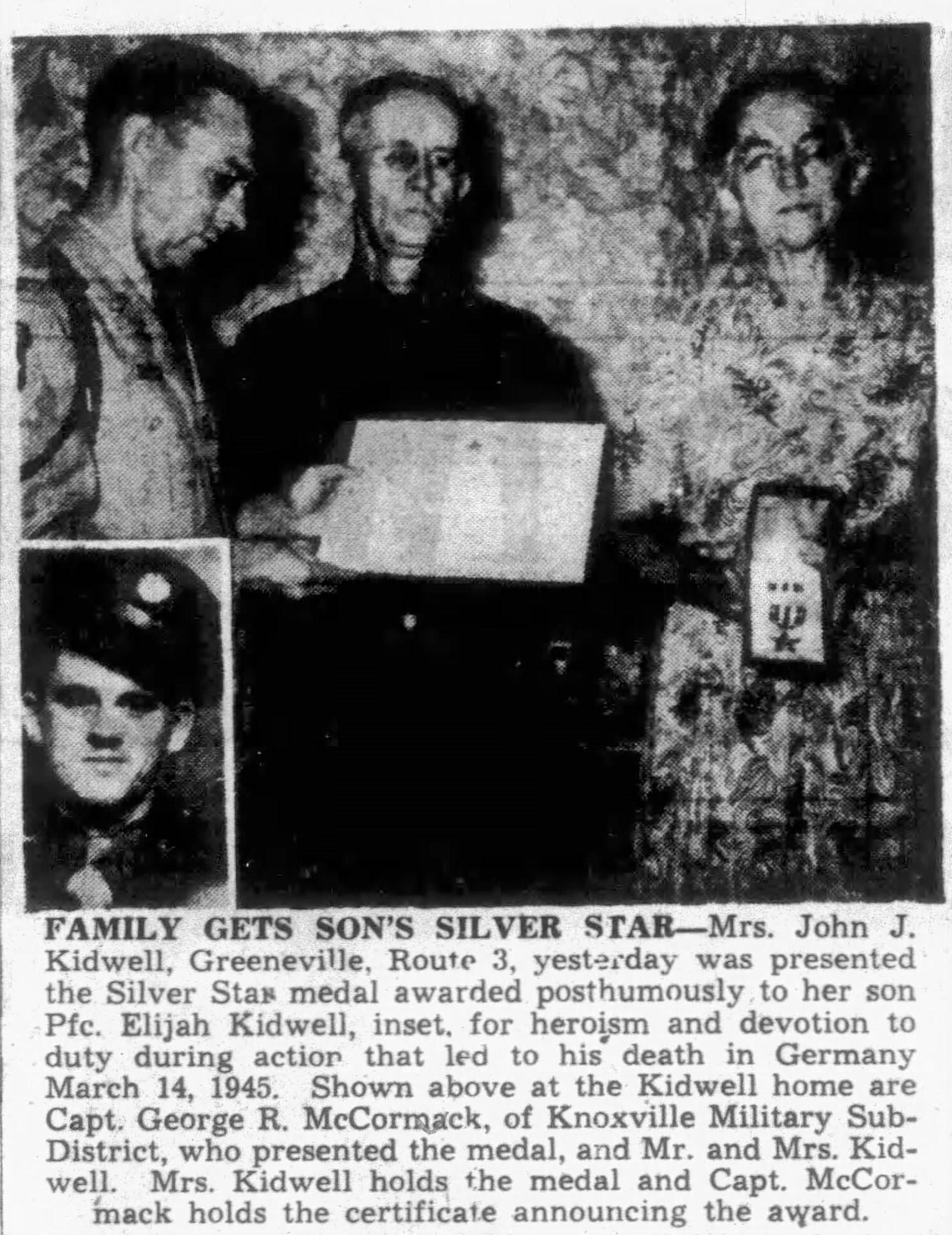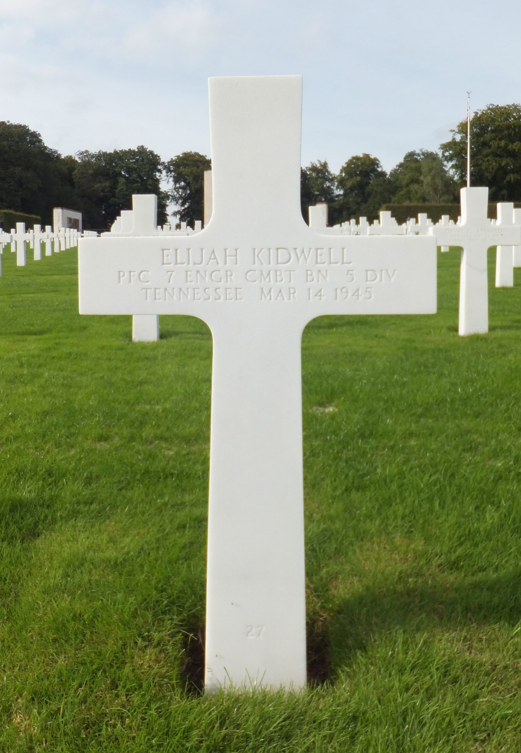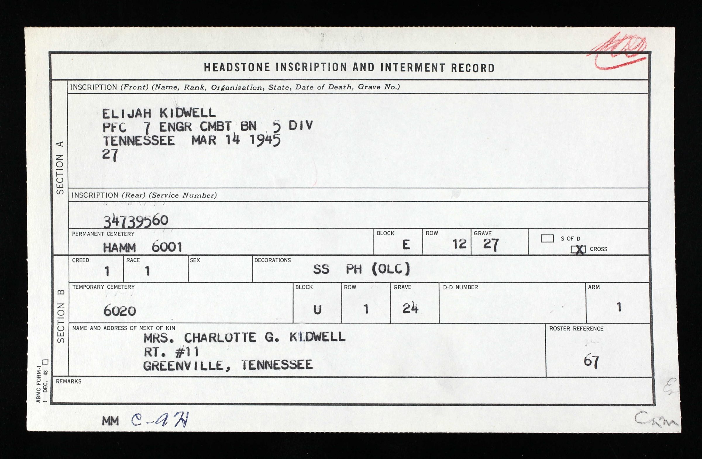 Elijah Kidwell was born in 1917 in Tennessee to John Jerome Kidwell and Claudia B. Brown. He married Charlotte Gaby in Virginia on 18 May 1938. Charlotte gave birth to a baby boy on 26 November 1941 but he died after several hours. Elijah Kidwell entered the service on 9 July 1943 at Fort Oglethorpe in Georgia.