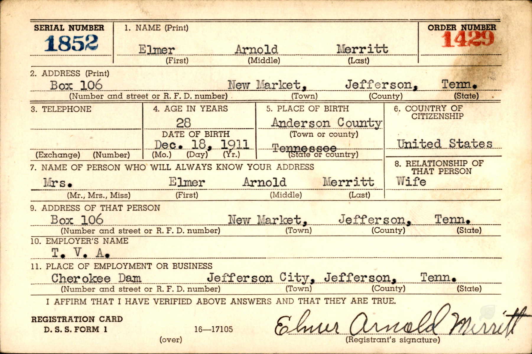 Wife: Mrs. Elmer A. Merrit, Rt 1, Andersonville, TN