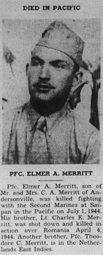 Pfc. Elmer A. Merritt, son of Mr. and Mrs. C.A. Merritt of Andersonville, was killed fighting with the Second Marines at Saipan in the Pacific on July 1, 1944. His brother, Charles E. Merritt was shot down and killed in action over Romania April 4, 1944. Another brother, Pfc. Theodore C. Merritt is in the Netherlands East Indies.