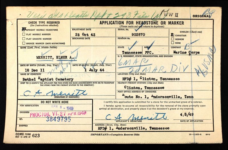 Private First Class Elmer Arnold Merritt was serving with the 2nd Marine Division. He was killed in the battle to take the Island of Saipan.
