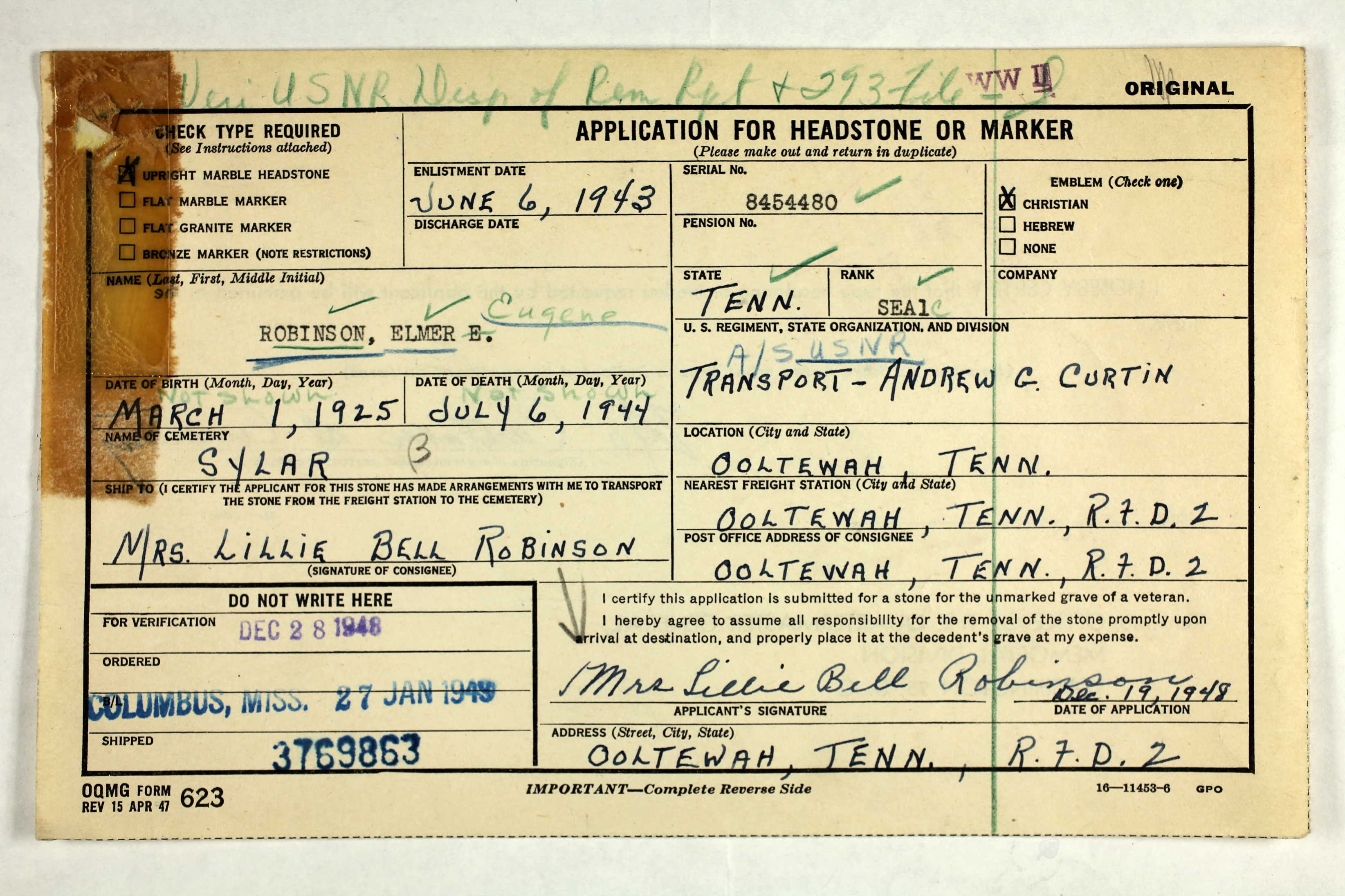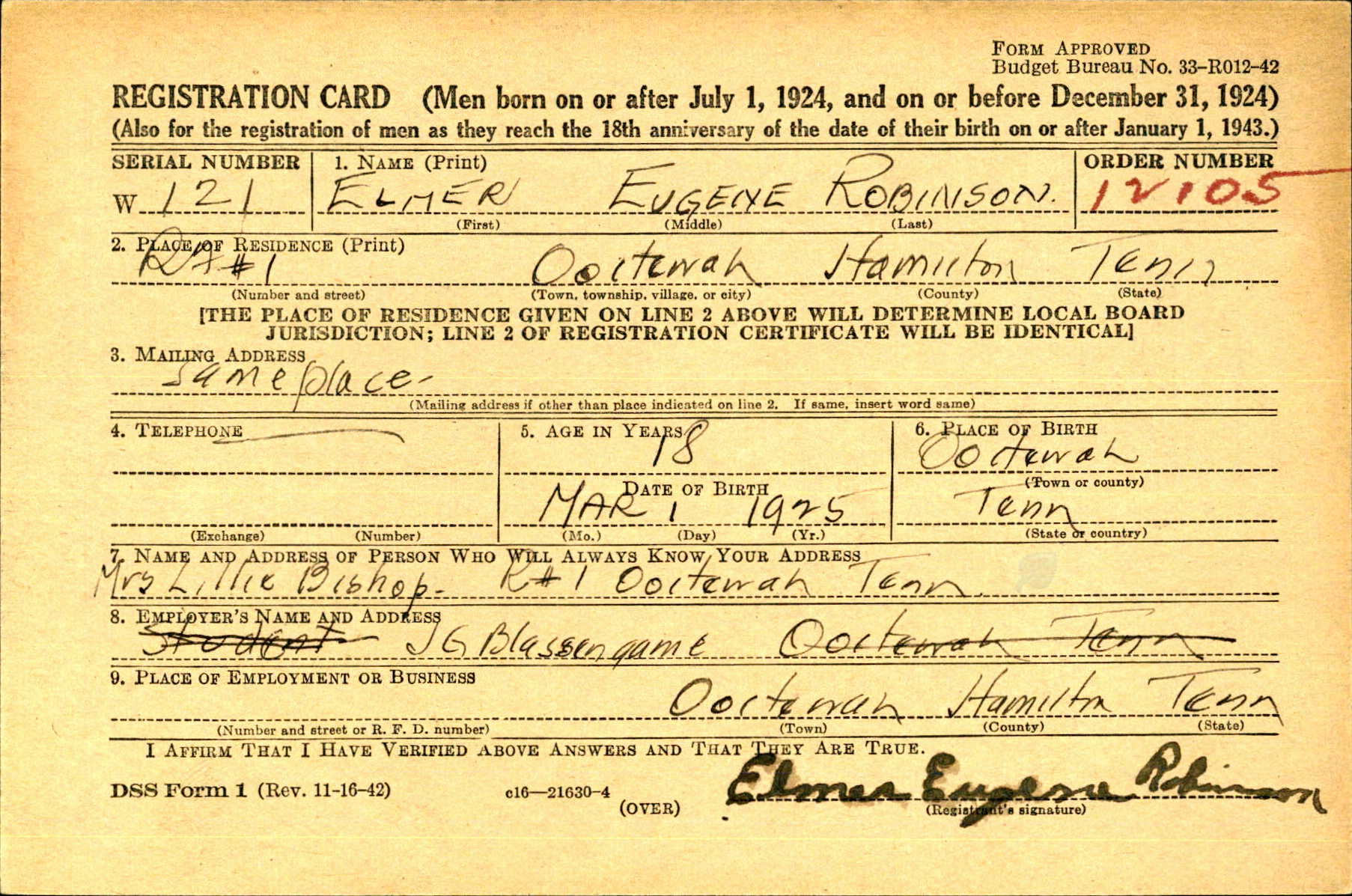 Elmer Eugene Robinson was born on 1 March 1925 at Ooltewah, Tennessee, the son of Jessie Albert Robinson and Lillie B. Fortner Robinson.