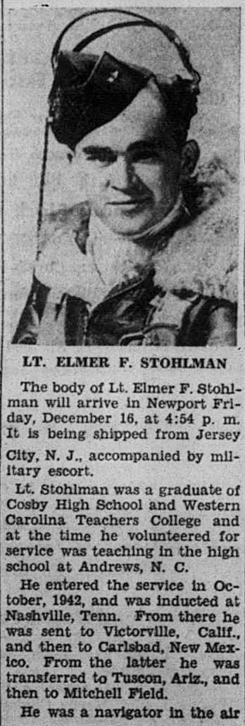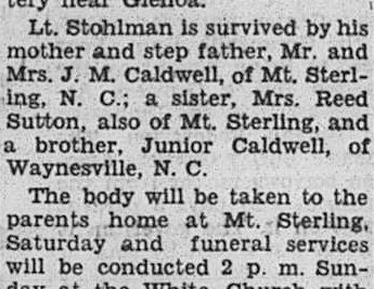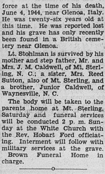 Lt. Stohlman was a graduate of Cosby High School and Western Carolina Teachers College and at the time he volunteered for service was teaching in the high school at Andrews, N.C. He entered the service in October, 1942, and was inducted at Nashville, Tenn. From there he was sent to Victorville, Calif., and then to Carlsbad, New Mexico. From the latter he was transferred to Tuscon, Ariz., and then to Mitchell Field. He was a navigator in the air force at the time of his death, June 4, 1944, near Glenoa, Italy. He was twenty-six years old at this time. He was reported lost and his grave has only recently been found in a British cemetery near Glenoa. Lt. Stohlman is survived by his mother and step father, Mr. and Mrs. J.M. Caldwell, of Mt. Sterling, N.C.; a sister, Mrs. Reed Sutton, also of Mt. Sterling, and a brother Junior Caldwell of Waynesville, N.C. The body will be taken to the parents’ home at Mt. Sterling and funeral services will be conducted at the White Church. Interment will follow with military services at the Grave.