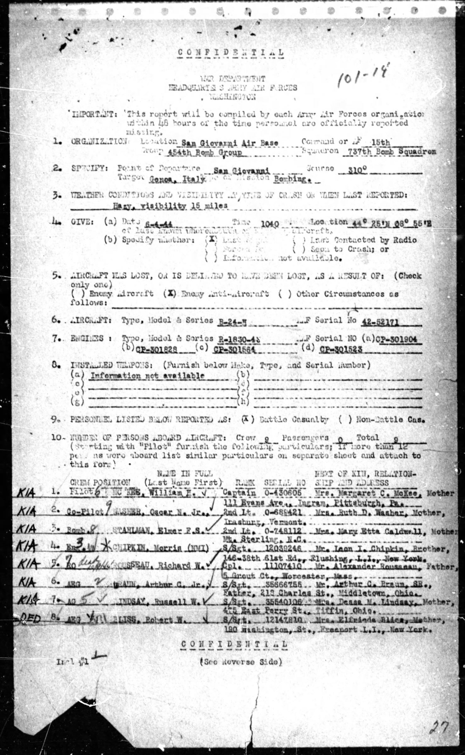 Aircraft B-24H with serial number 42-52171 departed from San Giovanni Air Base on a bombing mission to Genoa, Italy. The aircraft was shot down in the harbor of Genoa. The crew was initially buried at Campo Santo Cemetery at Genoa, American field.