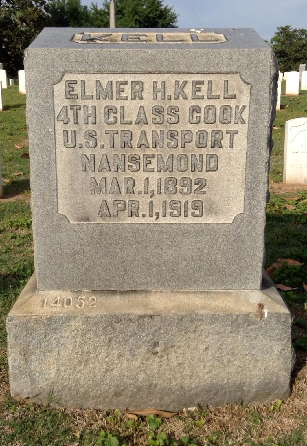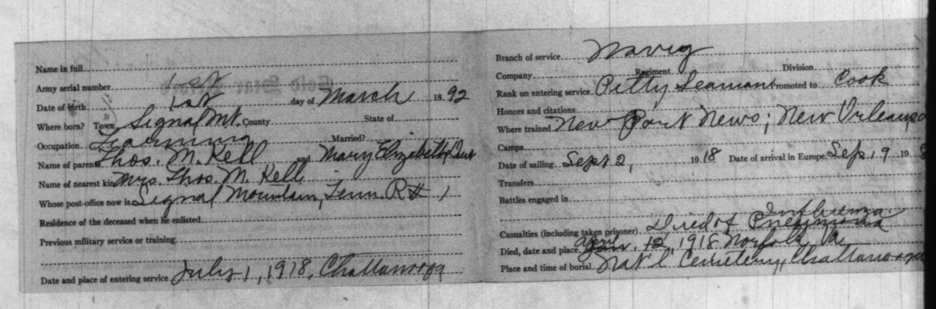 Elmer Herrold Kell was born on March 1, 1892, in Signal Mountain, Tennessee, the son of Thomas M. and Mary H. Kell. His siblings included sisters, Edith and Bessie, and brother, Russell. The son of a farmer, he worked as a carpenter in Fort Oglethorpe, Georgia, before enlisting in the United States Navy for service in World War I. He served as a 4th Class Cook aboard the US transport ship Nansemond before his death from influenza on April 1, 1919 in Norfolk, VA. He is buried at Chattanooga National Cemetery in Chattanooga, Tennessee.