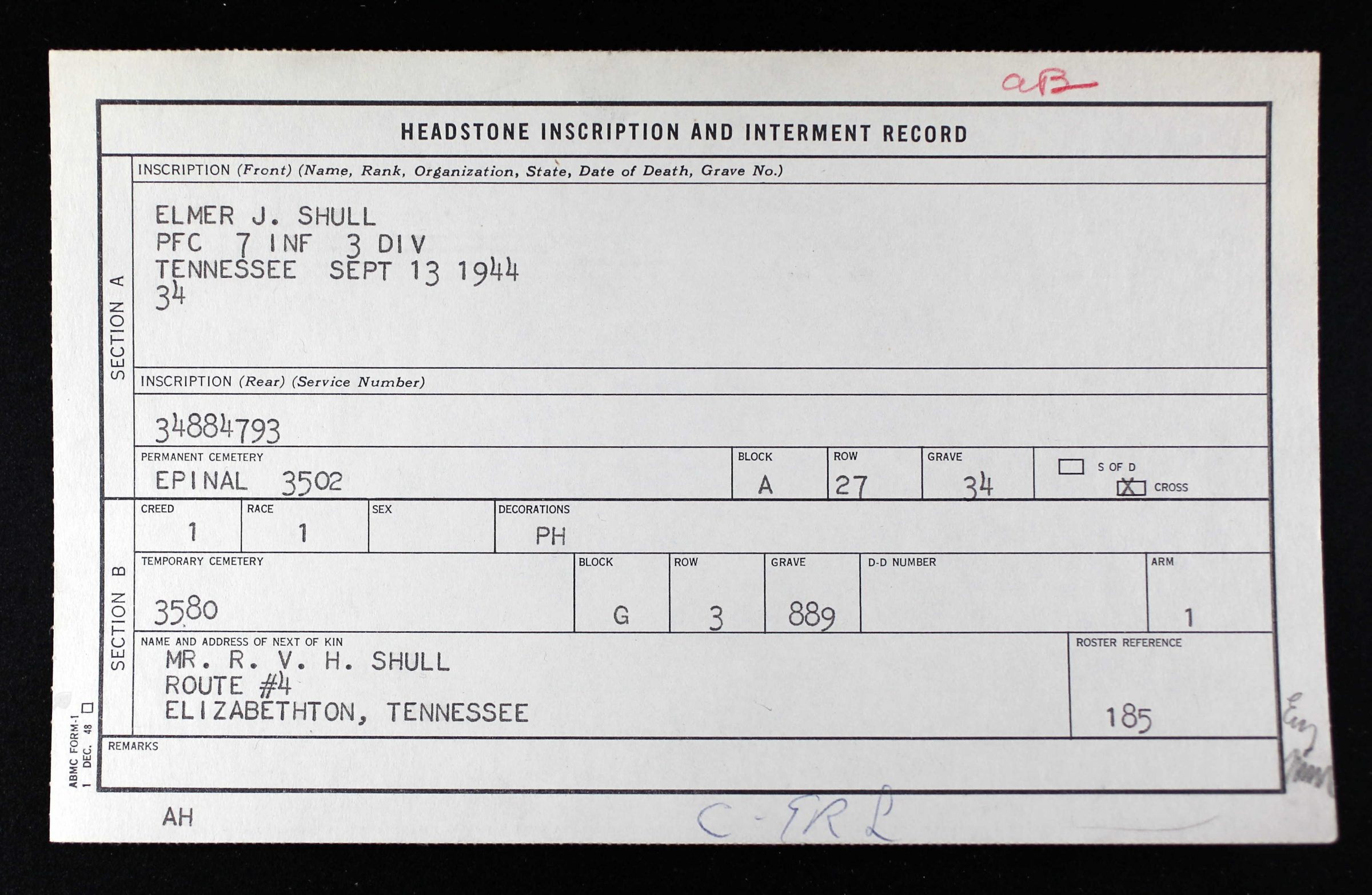 Elmer Shull was initially buried at Saint-Jean Cemetery, Besançon, France and reburied at Epinal American Cemetery, Epinal (Vosges), France, A, 27. 34