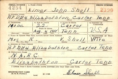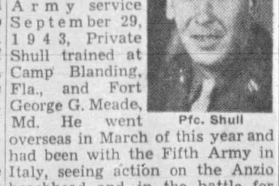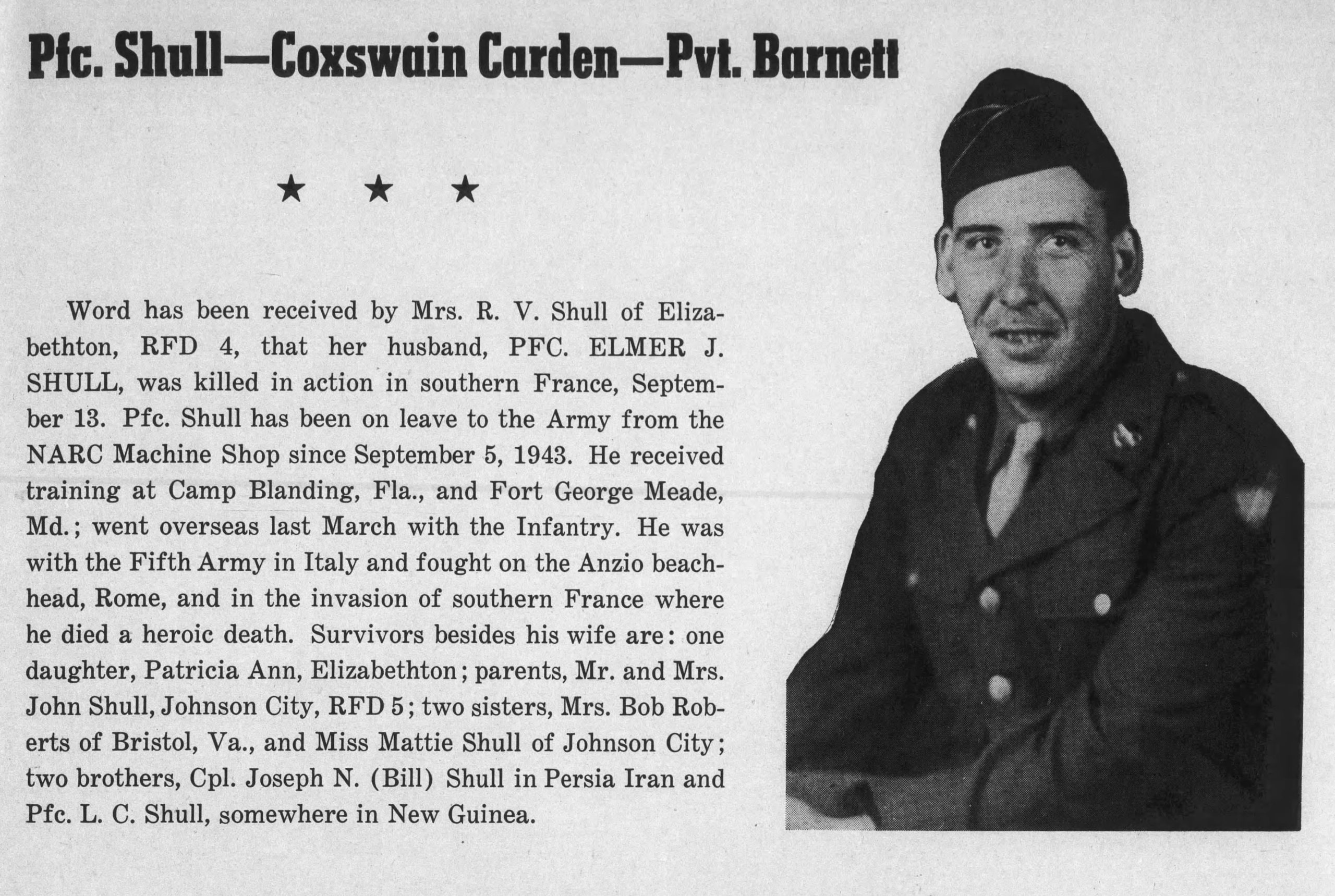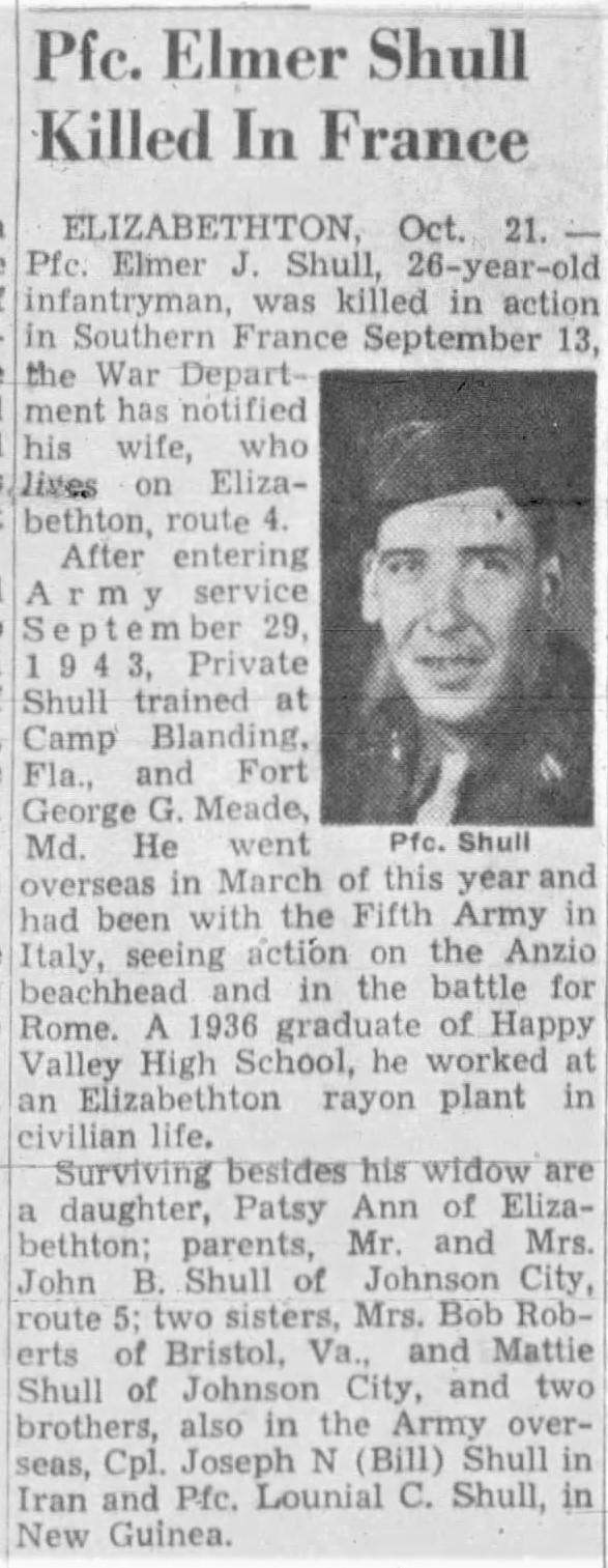Pfc. Elmer J. Shull, 26-year-old infantryman, was killed in action in Southern France September 13, the War Department has notified his wife, who lives in Elizabethton, route 4. After entering Army service September 29, 1943, Private Shull trained at Camp Blanding, Fla., and Fort George G. Meade, Md. He went overseas in March of this year and had been with the Fifth Army in Italy, seeing action on the Anzio beachhead and in the battle for Rome. A 1936 graduate of Happy Valley High School, he worked at an Elizabethton rayon plant in civilian life. Surviving besides his widow are a daughter, Patsy Ann of Elizabethton; parents, Mr. and Mrs. John B. Shull of Johnson City, route 5; two sisters, Mrs. Bob Roberts of Bristol, Va., and Mattie Shull of Johnson City and two brothers, also in the Army overseas, Cpl. Joseph N. (Bill) Shull in Iran and Pfc. Lounial C. Shull, in New Guinea.
