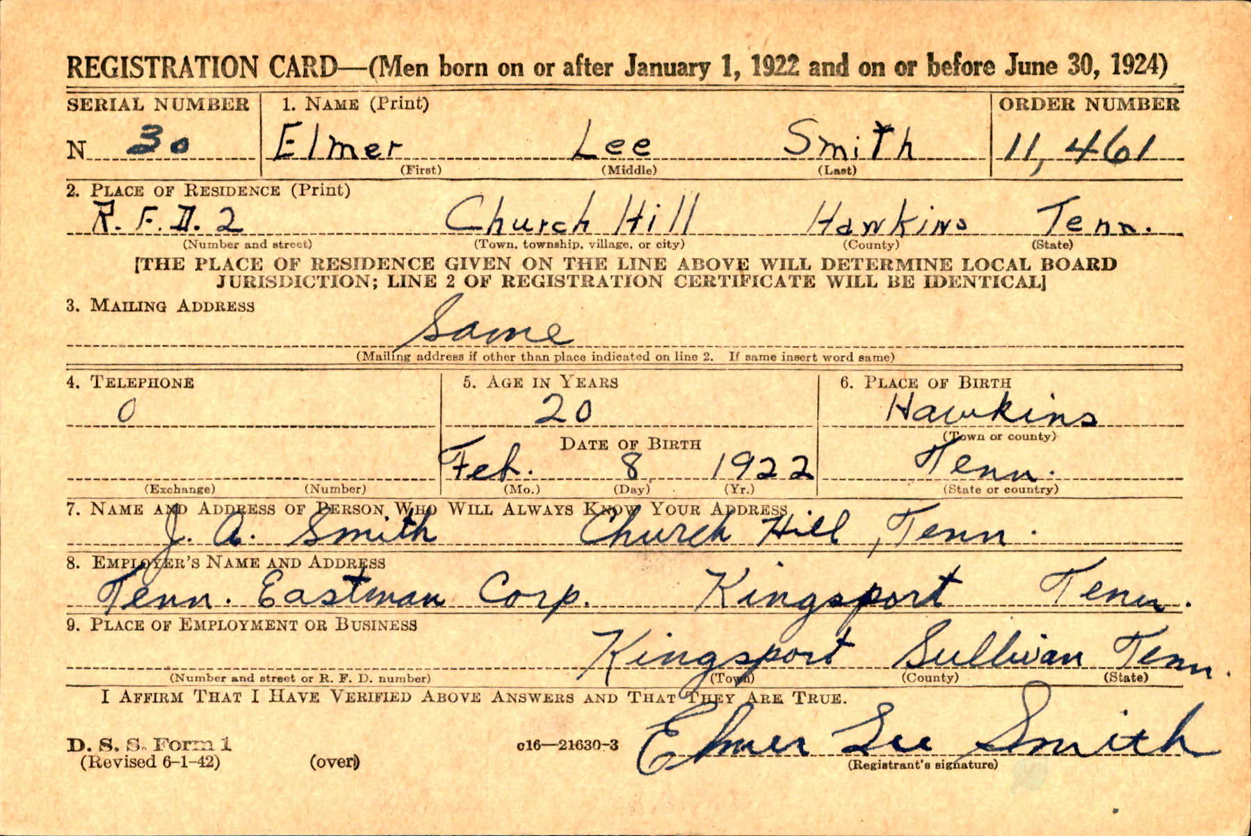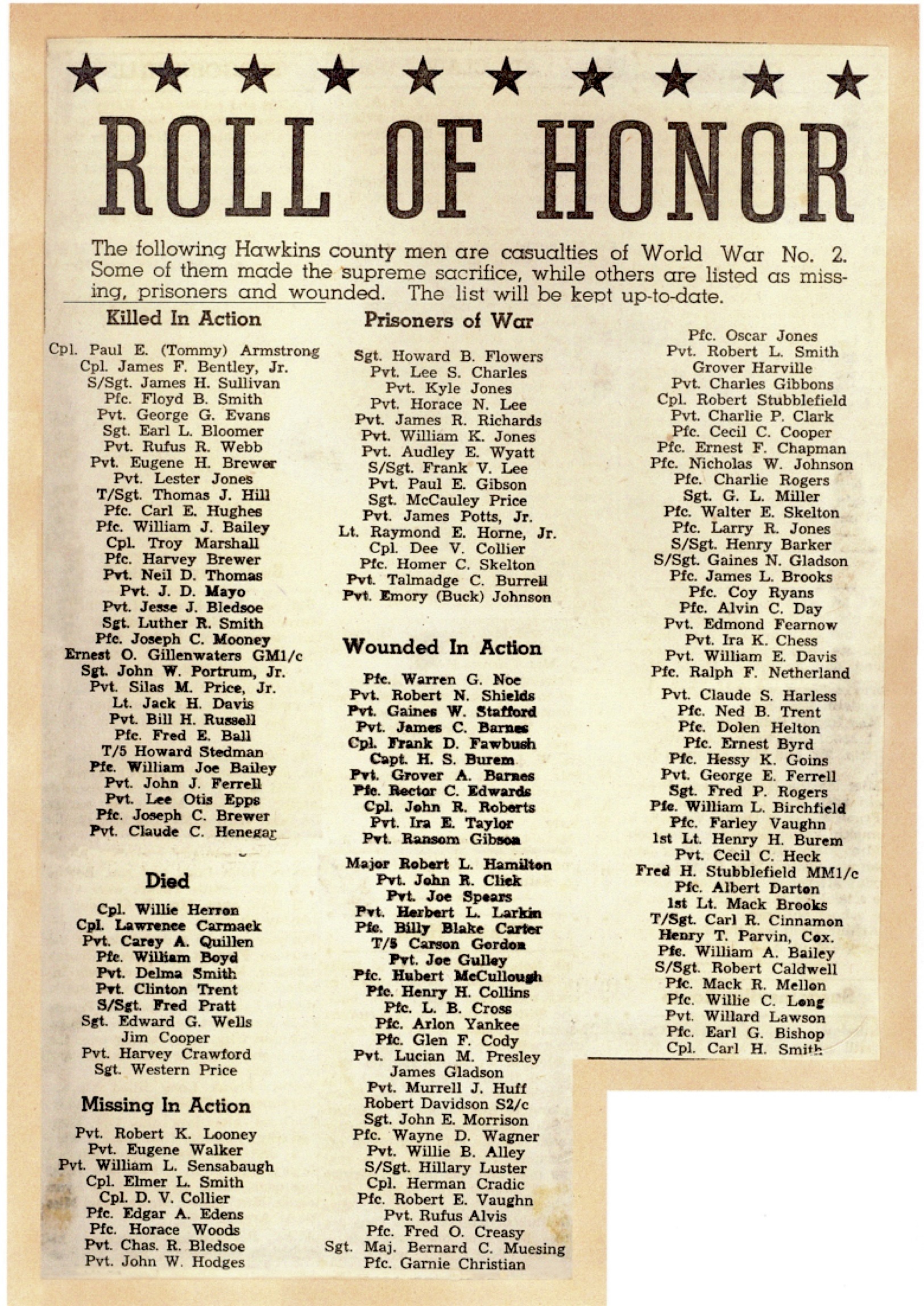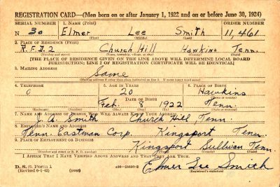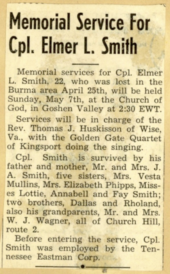 Memorial services for Cpl. Elmer L. Smith, 22, who was lost in the Burma area April 25th, will be held at the Church of God, in Goshen Valley. Cpl. Smith is survived by his father and other, Mr. and Mrs. J.A. Smith, five sisters, Mrs. Vesta Mullins, Mrs. Elizabeth Phipps, Misses Lottie, Annabell and Fay Smith; two brothers, Dallas and Rholand, also his grandparents, Mr. and Mrs. W.J. Wagner, all of Church Hill, Route 2. Before entering the service, Cpl. Smith was employed by the Tennessee Eastman Corp.