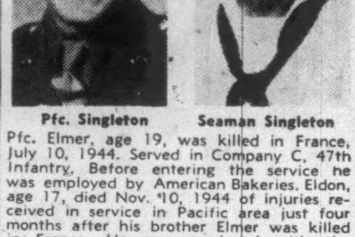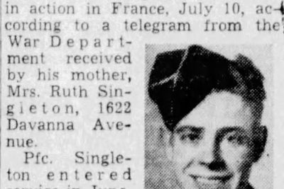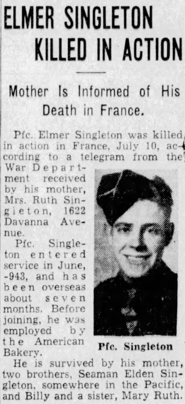 Pfc. Elmer Singleton was killed in action in France, July 10, according to a telegram from the War Department received by his mother, Mrs. Ruth Singleton, 1622 Davanna Avenue. Pfc. Singleton entered service in June, 1943, and has been overseas about seven months. Before joining, he was employed by the American Bakery. He is survived by his mother, two brothers, Seaman Elden Singleton, somewhere in the Pacific, and Billy and a sister, Mary Ruth.
