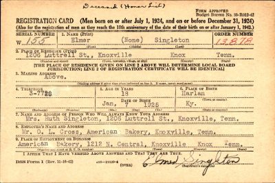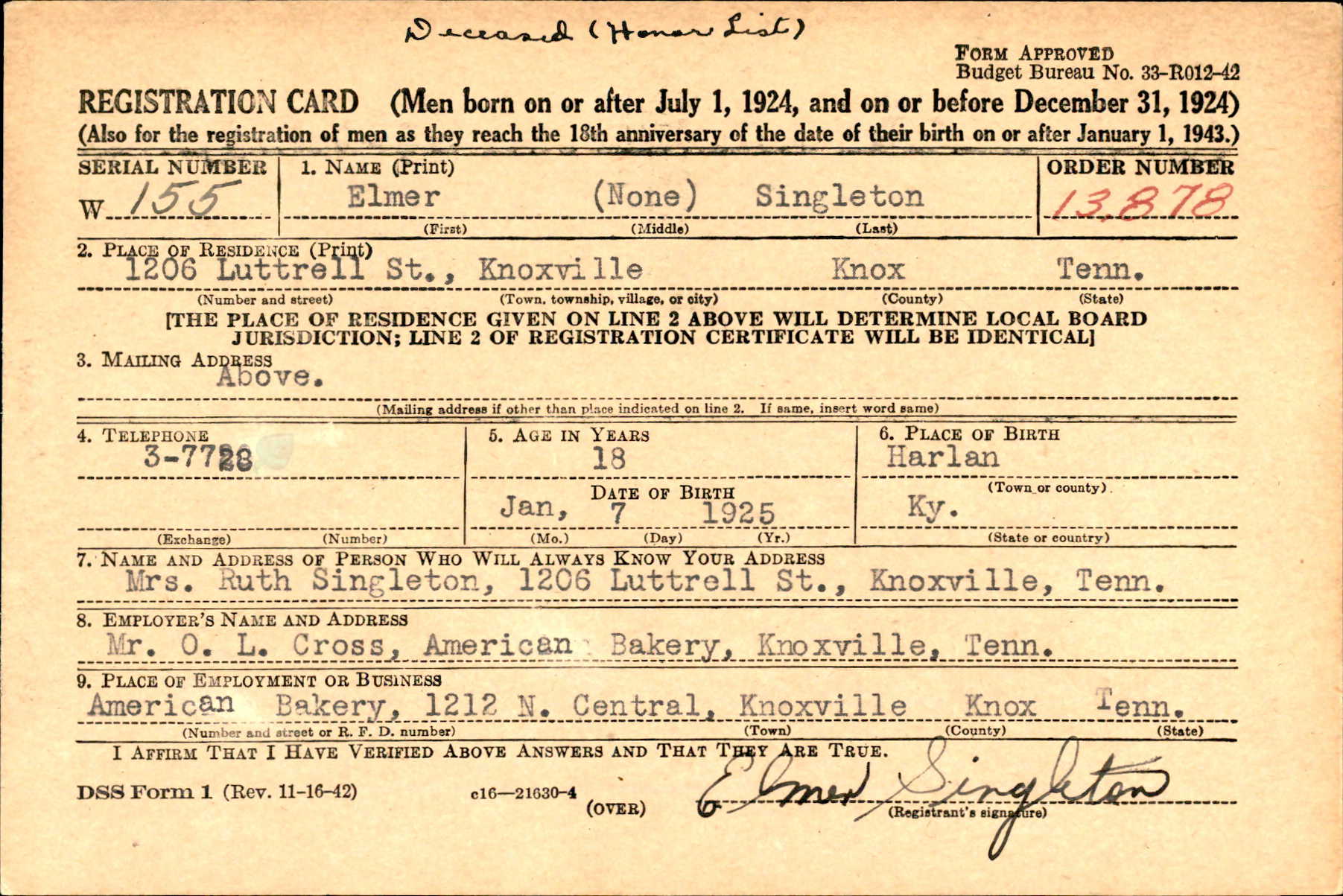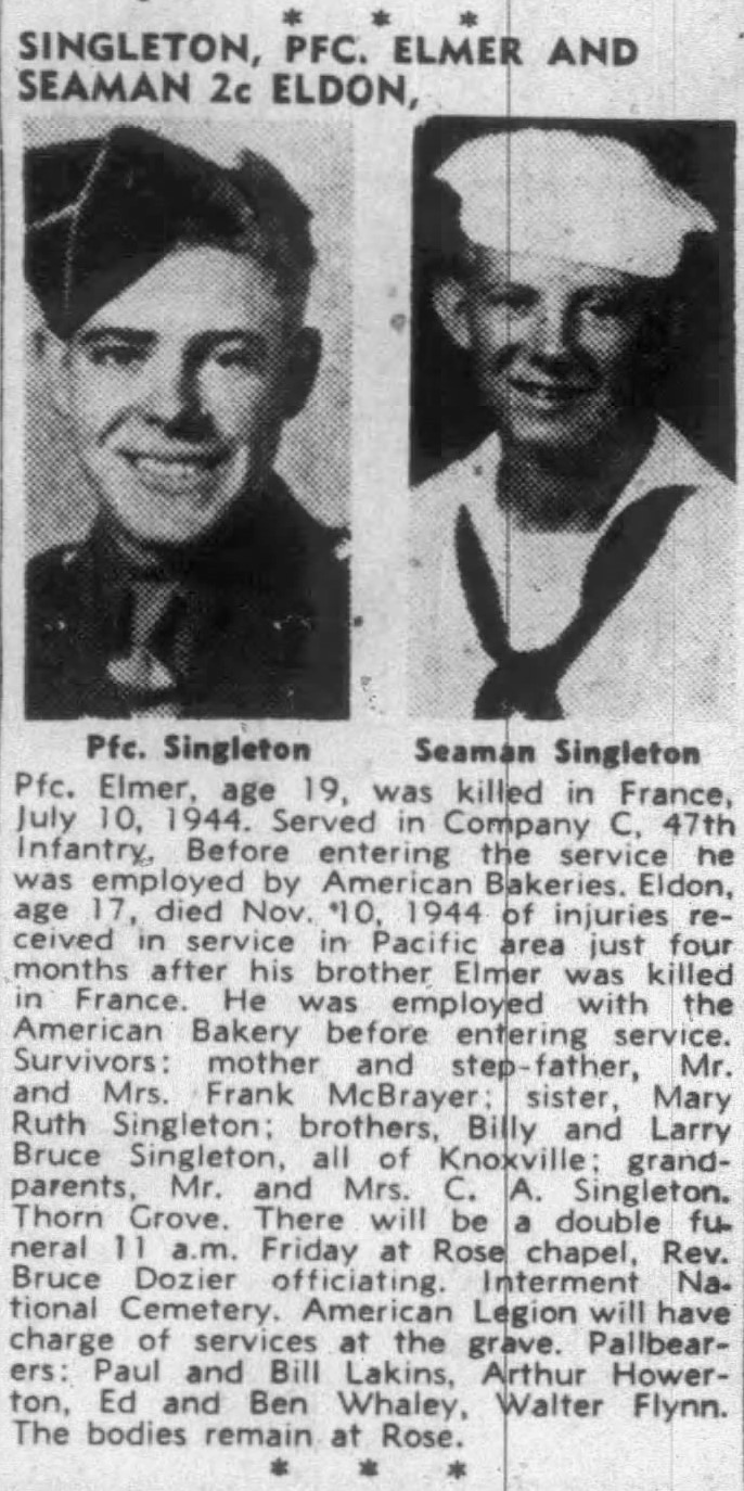 Pfc. Elmer, age 19, was killed in France, July 10, 1944. Served in Company C, 47th Infantry. Before entering the service he was employed by American Bakeries. Elson, age 17, died November 10, 1944 of injuries received in service in Pacific area just four months after his brother Elmer was killed in France. He was employed with the American Bakery before entering service. Survivors: mother and step-father, Mr. and Mrs. Frank McBrayer; sister, Mary Ruth Singleton; brothers, Billy and Larry Bruce Singleton, all of Knoxville. Grandparents, Mr. and Mrs. C.A. Singleton, Thorn Grove.