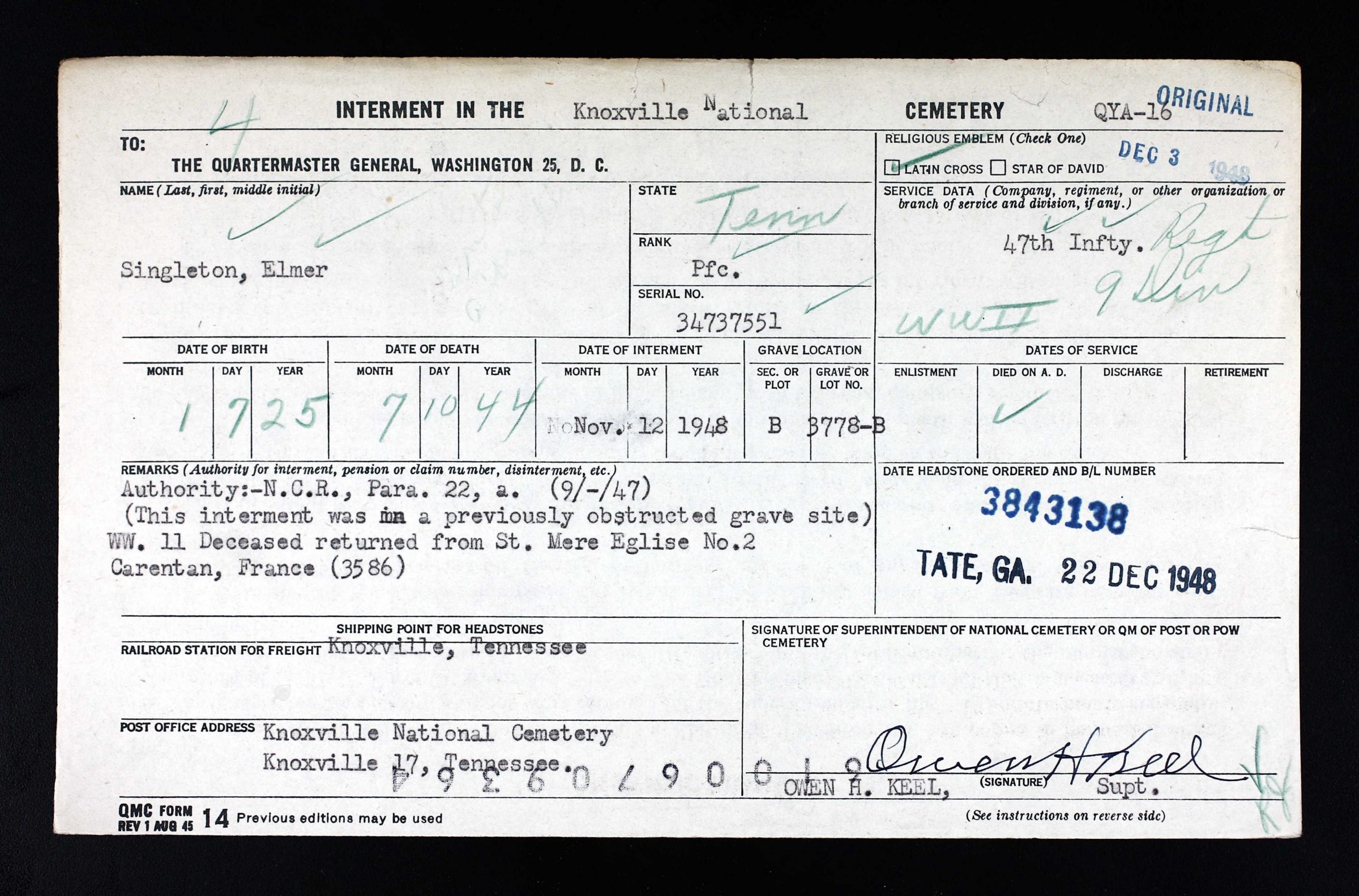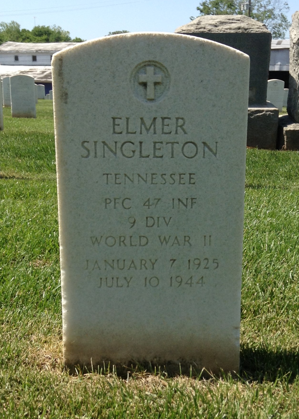 Elmer Singleton was killed on the Beaches at Normandy. He was initially buried at Ste-Mère-Eglise No. 2 at Carentan, France. Buried in Knoxville National Cemetery on November 12, 1948 (Section B Plot 3788-B)