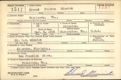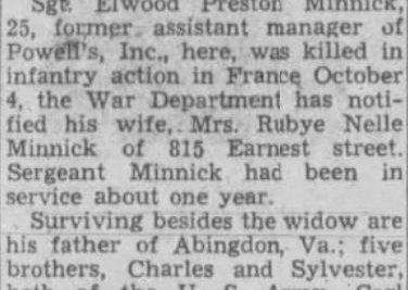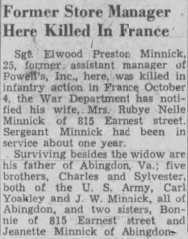 Sgt. Elwood Preston Minnick, 25, former assistant manager of Powell’s, Inc., here was killed in infantry action in France October 4, the War Department has notified his wife, Mrs. Rubye Nelle Minnick of 815 Earnest street. Sergeant Minnick had been in service about one year. Surviving besides his widow are his father of Abingdon, Va.; five brothers, Charles en Sylvester, both of the U.S. Army, Carl, Yoakley and J.W. Minnick, all of Abingdon, and two sister Bonnie of 815 Earnest street and Jeanette Minnick of Abingdon.