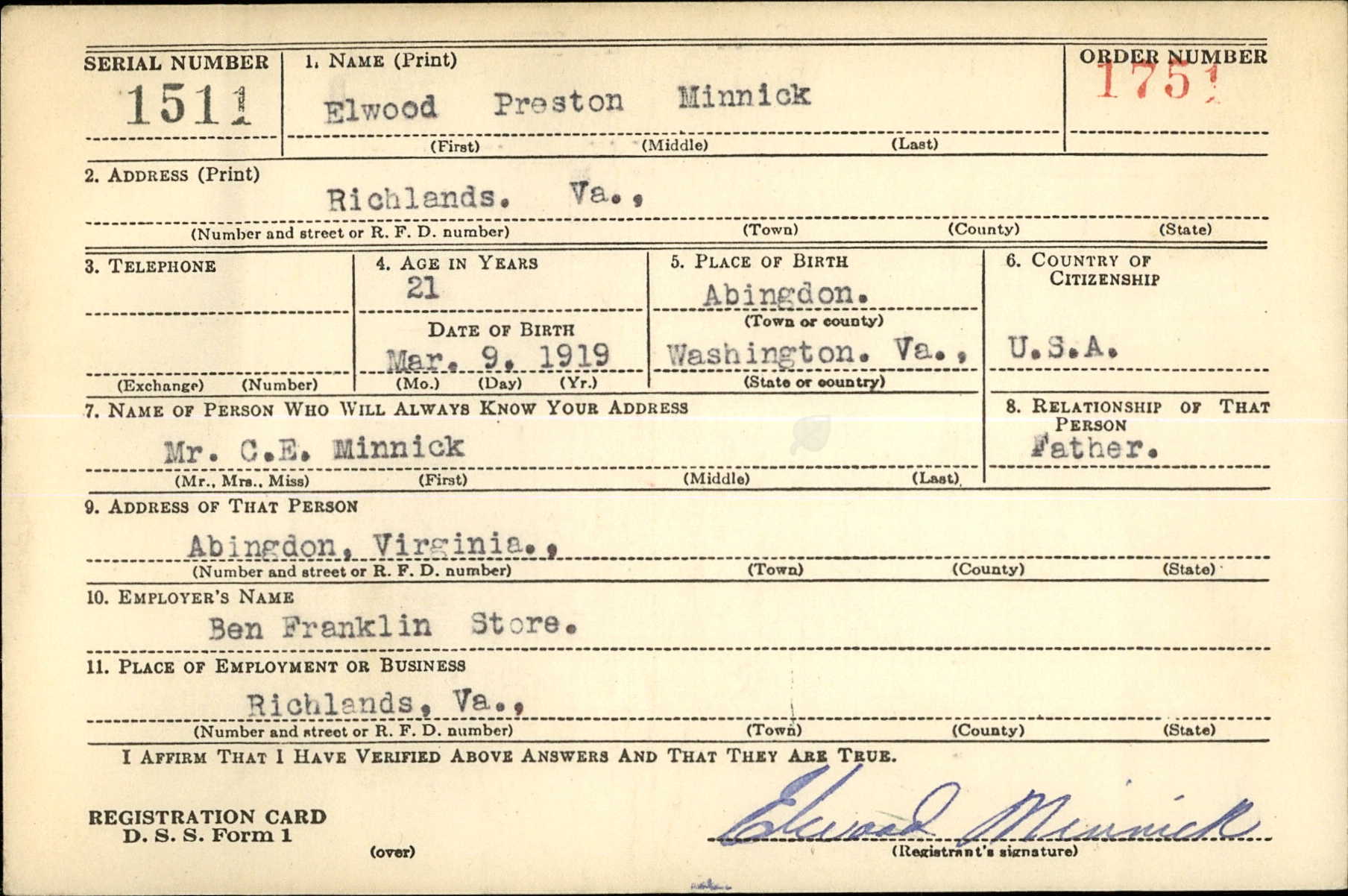He was 25 years old and the son of Conley Edgar Minnick and Maude Frances Woodward. He was married to Rubye Nell Watts. Elwood’s brothers: Charles Minnick and Sylvester Minnick both served in the US Army during World War II.
