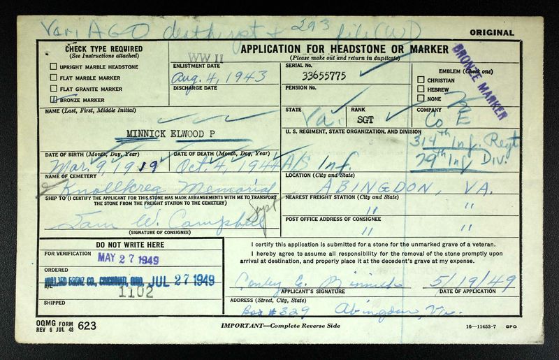 Elwood Preston Minnick was born in North Fork, Virginia, but called Johnson City, Tennessee home. He enlisted from Washington County, Tennessee on 4 August 1943 in Abingdon, Virginia. Elwood was assigned to Company E, 2nd Battalion, 314th Infantry Regiment, 79th Infantry Division.