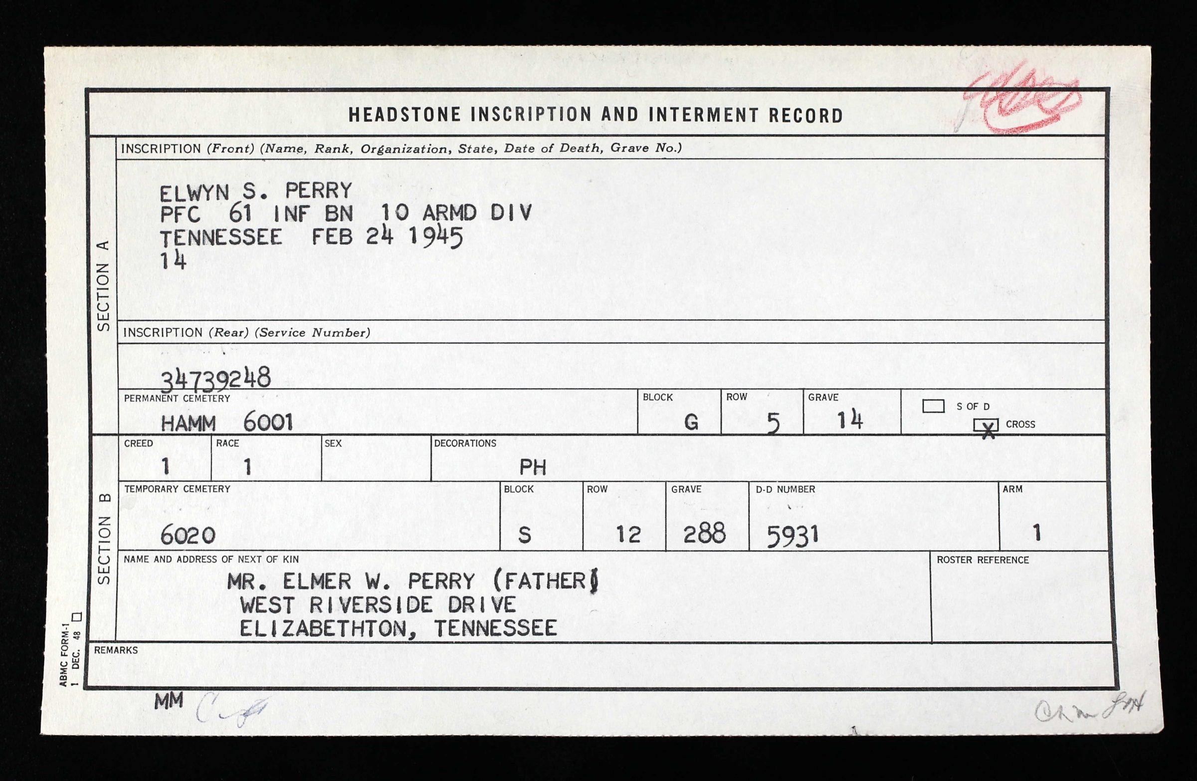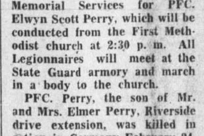 Elwyn Scott Perry was born in 1925 in Elizabethton and was the son of Elmer Williamson Perry and Evelyn Josephine Scott. He was always known as Buster growing up. He had two sisters, Doris and Eugenia. Doris later joined the WACs during WWII.