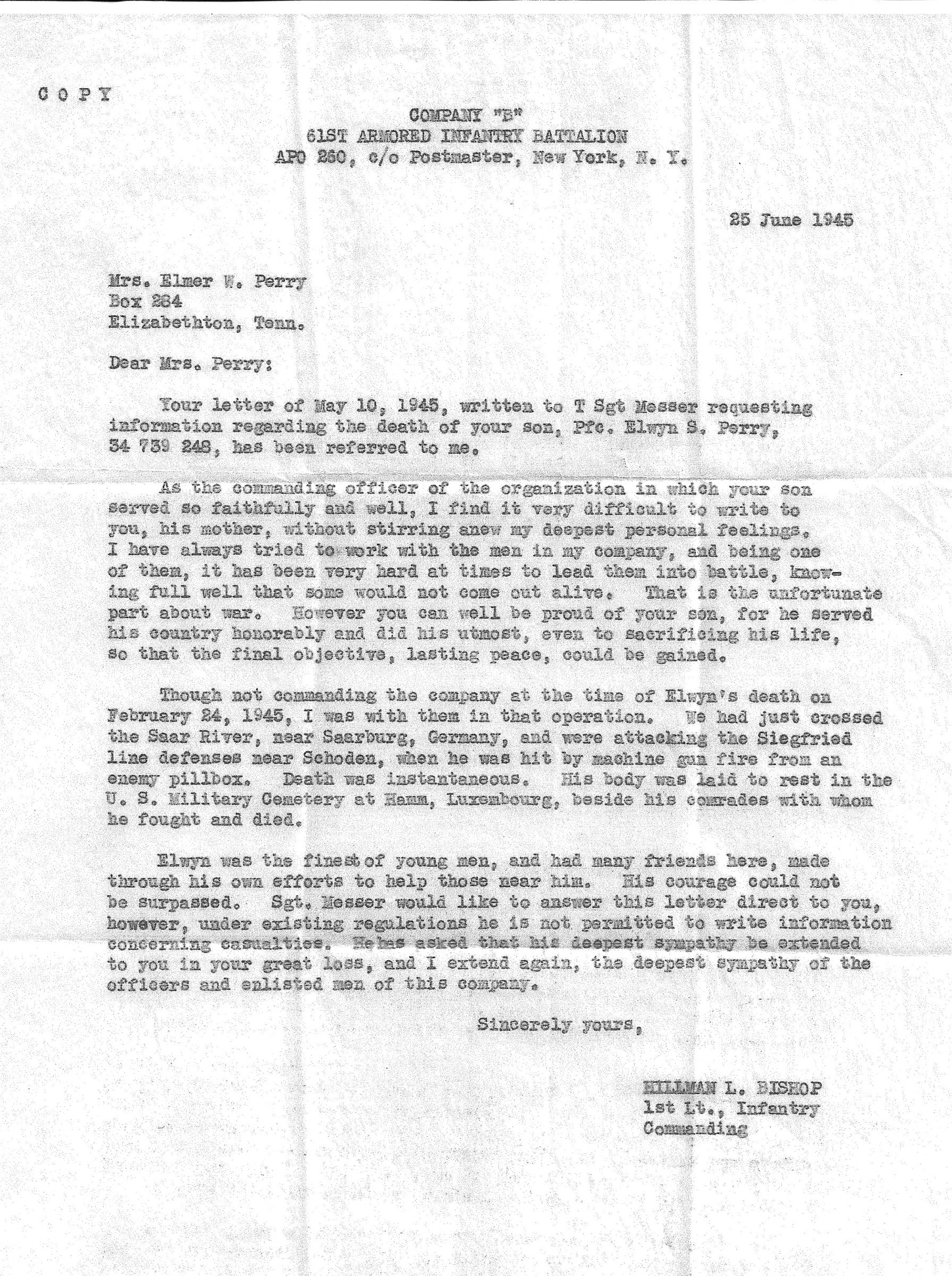 He died 24 February 1945 at the Battle of the Siegfried Line, Schoden, Germany. He was with the 61st Armored Infantry, Company B. He was killed in action and buried at Luxembourg American Cemetery, Luxembourg, G, 5, 14.