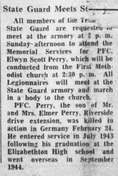 Elwyn Scott Perry was born in 1925 in Elizabethton and was the son of Elmer Williamson Perry and Evelyn Josephine Scott. He was always known as Buster growing up. He had two sisters, Doris and Eugenia. Doris later joined the WACs during WWII.
