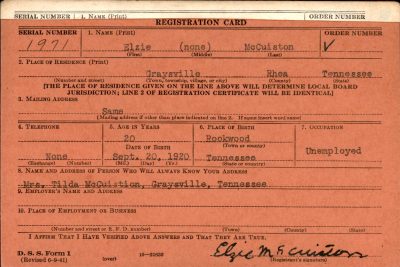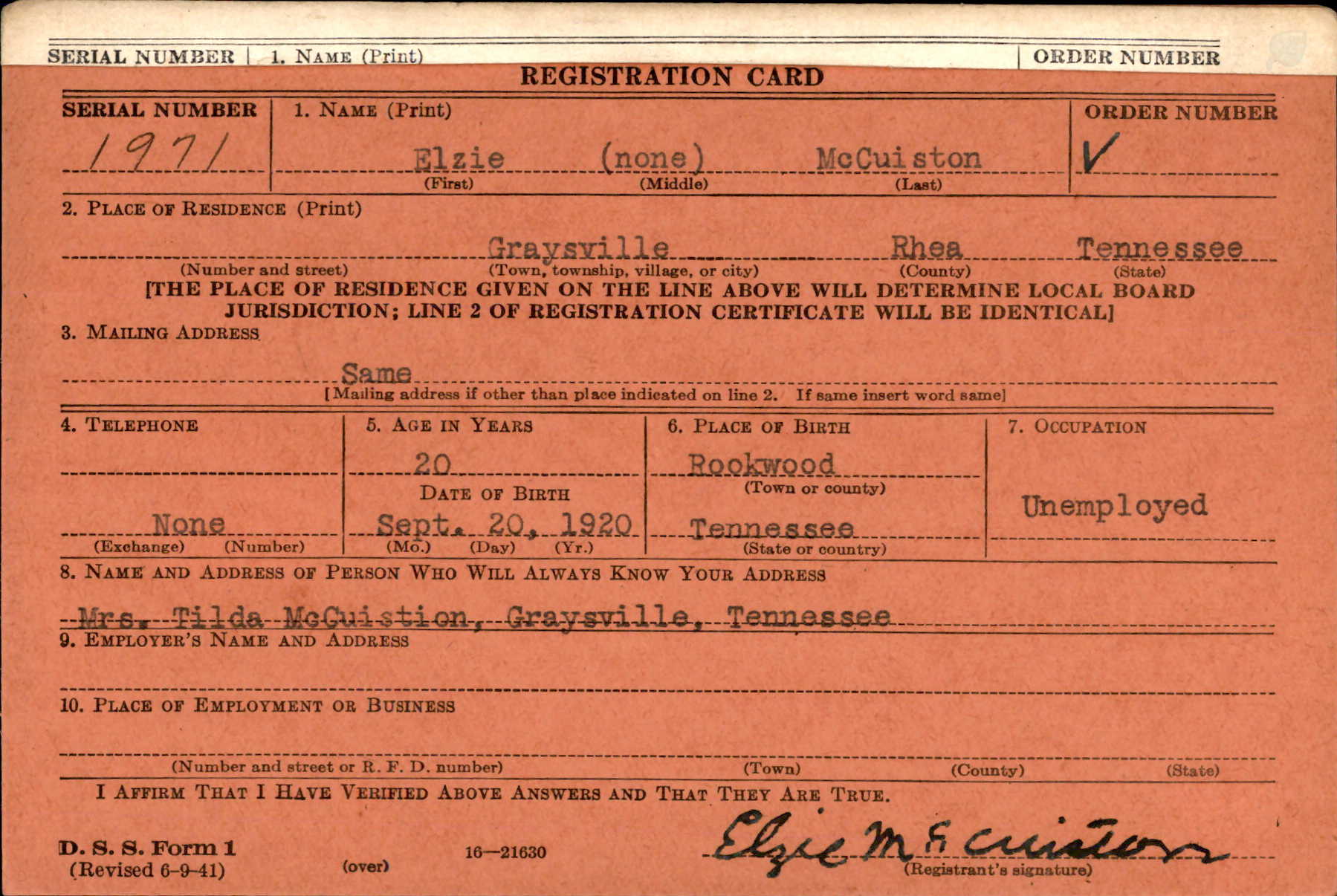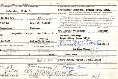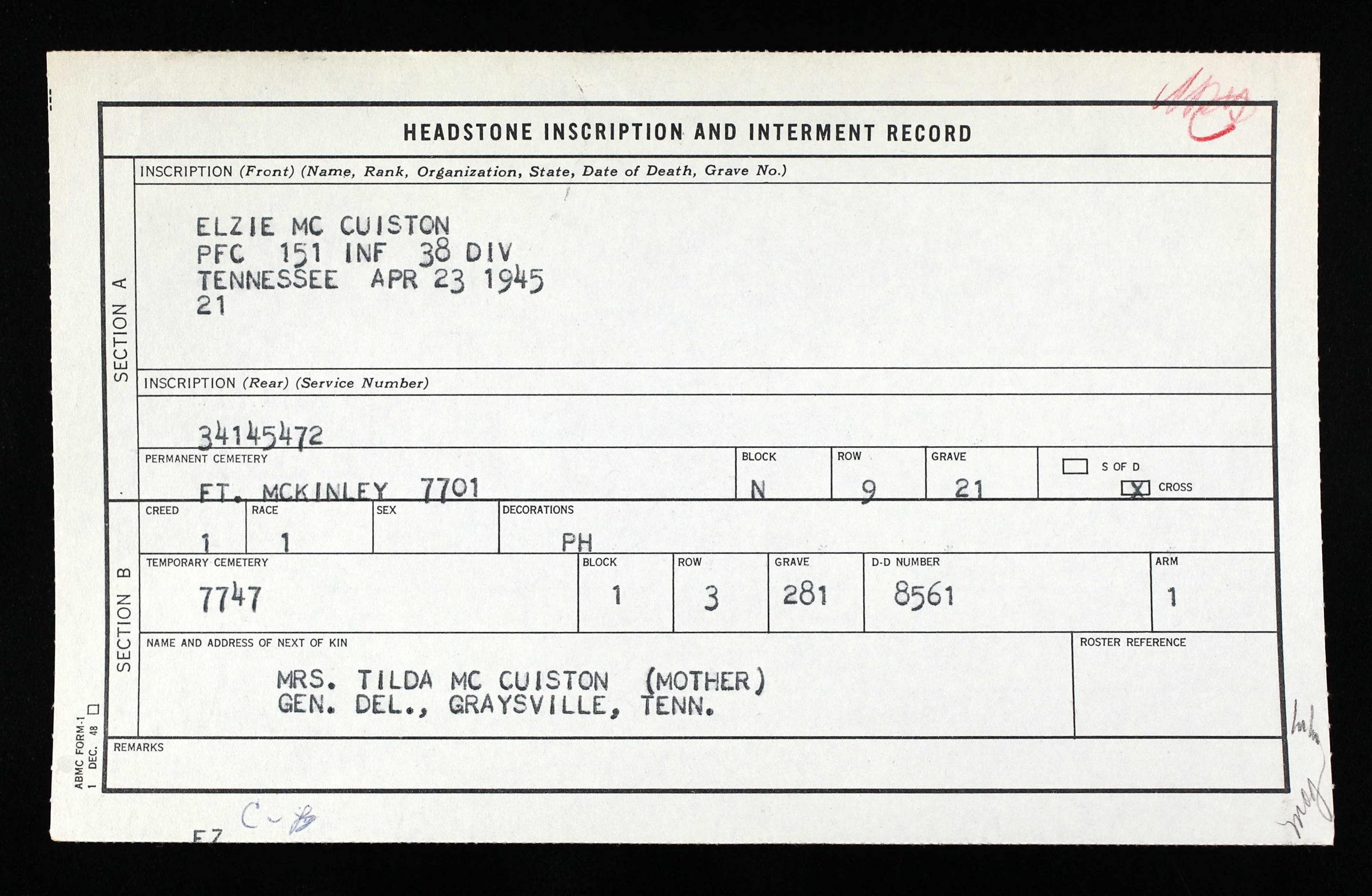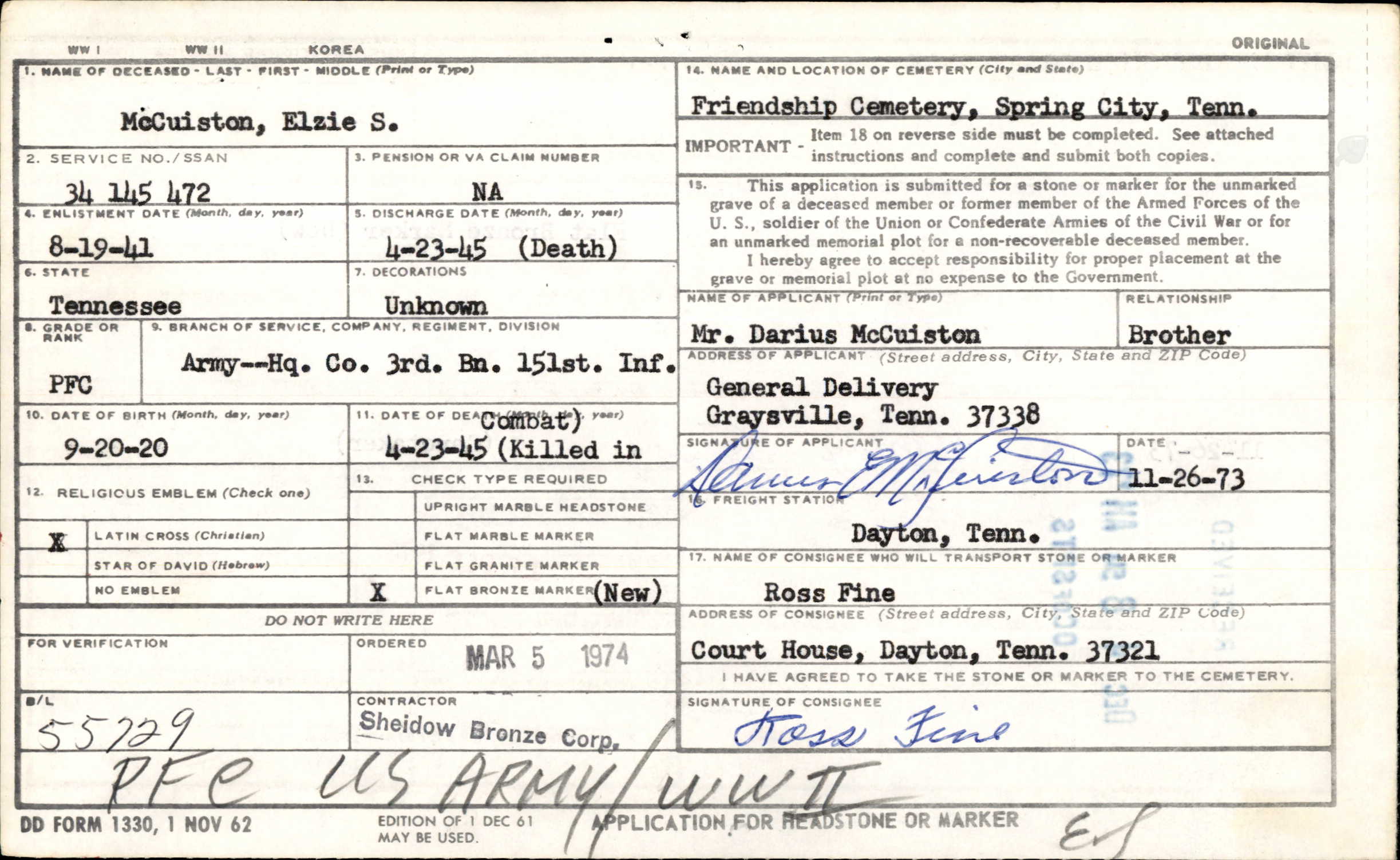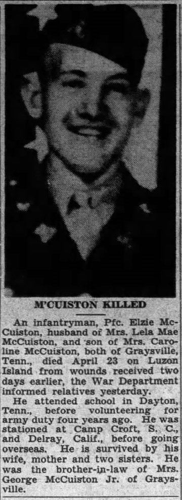 Elzie McCuiston was the son of George Newton McCuiston and Tilda Caroline Yother. He died on April 23 on Luzon Island from wounds received two days earlier. He attended school in Dayton, Tenn., before volunteering for army duty in 1941. He was stationed at Camp Croft, S.C., and Delray, Calif., before going overseas. His brother, Tec5 George N. McCuiston was killed in action in Germany. Elzie McCuiston was the husband of Lela Mae McCuiston.