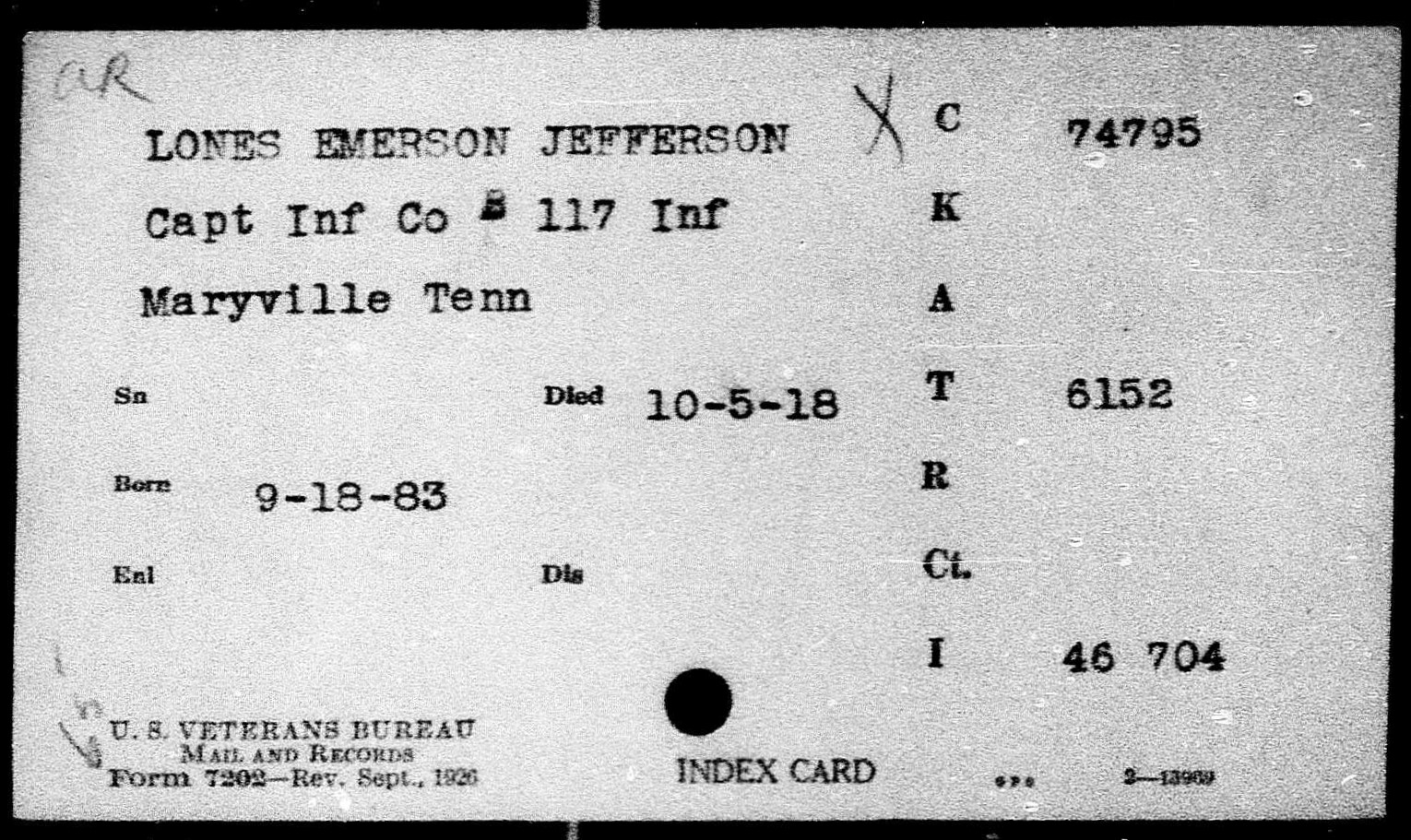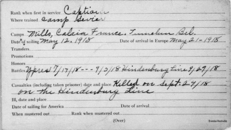 Captain Lones served with Company B, 117th Infantry Regiment, 30th Infantry Division and was killed in action on the Hindenburg Line.