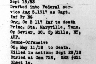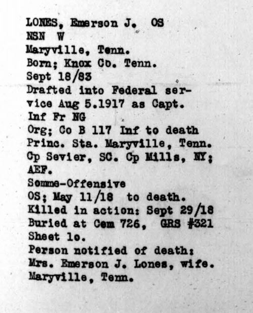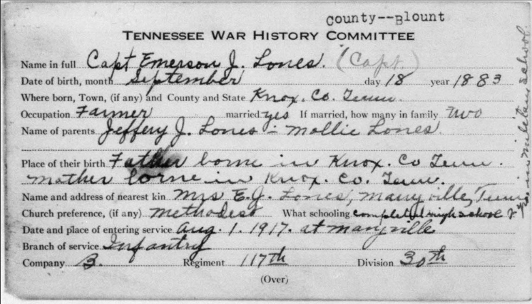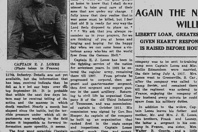 Another gold star, the emblem of supreme sacrifice must be added to Blount County’s service flag. This time the noble son who offered his all that he world might be saved from the terrors of the Hun is Captain E.J. Lones, leader of our Blount County boys of Company B, 117th Infantry. Details are not yet available, but the information that he fell as he led our boys over the top September 29. It is probable that within the next few days letters may be received telling of the action and the manner in which death resulted. Nearly a month has elapsed since the battle, but the terrible pressure under which all departments are working in the field makes it possible to forward information more speedily, it seems. The first word regarding Captain Lones’ death came in a roundabout way. Captain Stannis of Knoxville wrote his wife that among the killed in the battle of September 29th was Captain E.J. Lones of Maryville and Major Wyrick wrote his wife that perhaps the only one of the killed that she would know was Captain Lones. Following the receipt of this information Postmast Jas. M. Cates wired Senator Shields in Washington to ascertain if anything in the war department was available. In response to this message nothing has been received. Up to the recept of the last letters from members of Company B, not a man had been wounded. There had been many narrow escapes, and it was miraculous that none had been hurt. This may be due to the fact that Captain Lones was such an efficient officer in the field. As a national guard officer his superiors frequently commented on his ability to protect his men, yet place them in positions where they would be doing fearful execution to the enemy. Perhaps no captain in the state was as capable of handling men in the field as Captain Lones. In August he wrote The Enterprise a letter in which he said, “I want all the good people at home to know that I shall do my utmost to take good care of their sons that are under my charge. I fully know that they realize that in war some must be killed, but I feel that old B is ready for anyway the Lord feels disposed to place us. **** We ask that you always remember us in your prayers, for we are thinking of you at home and longing and hoping for the happy day when we can come home a victorious army who has set the world free from the German Hell.”