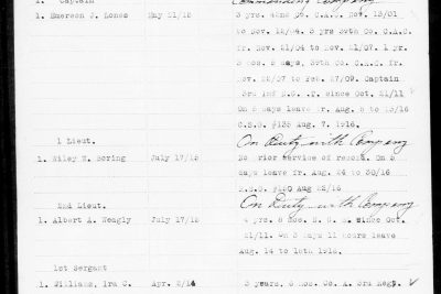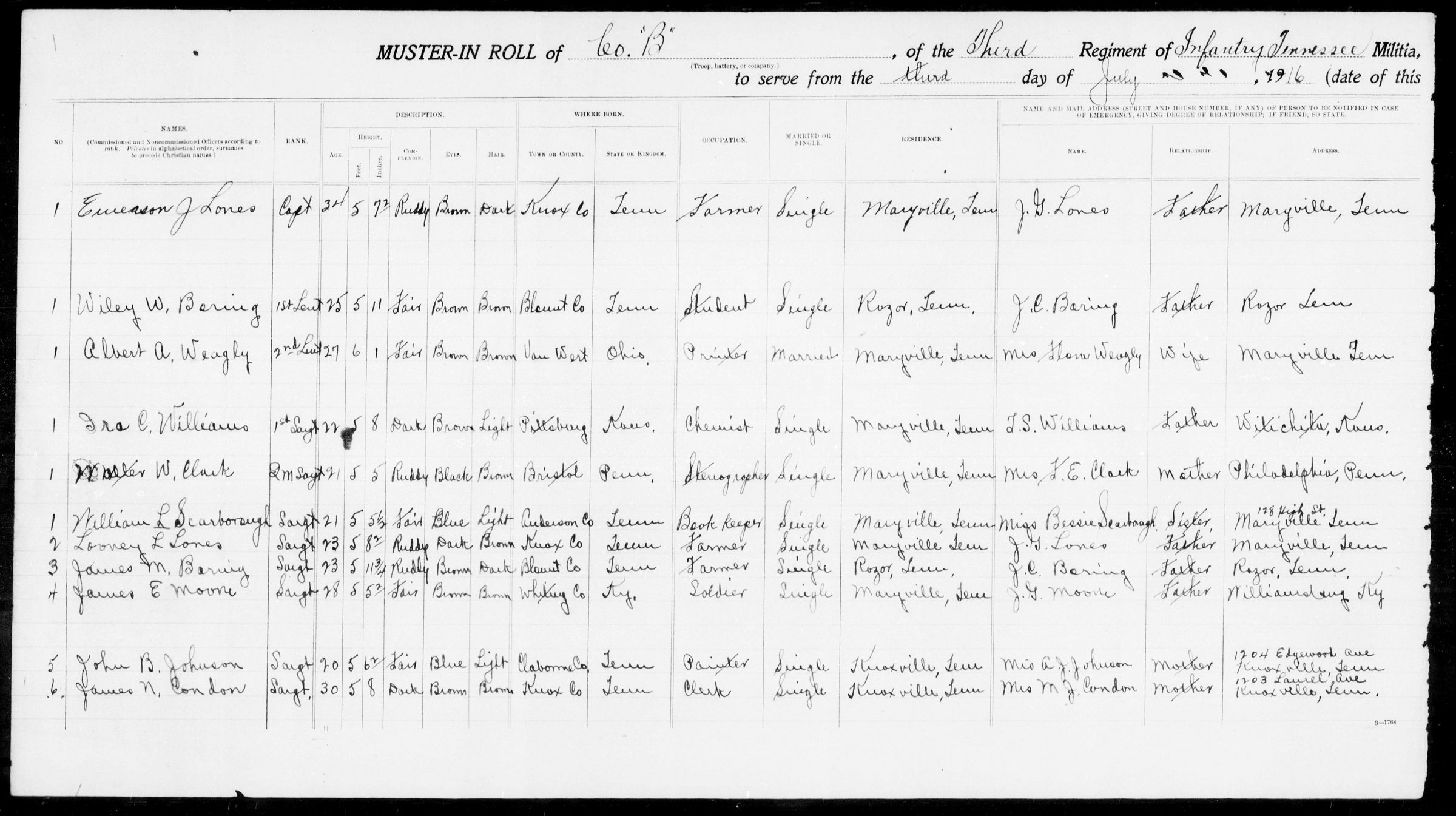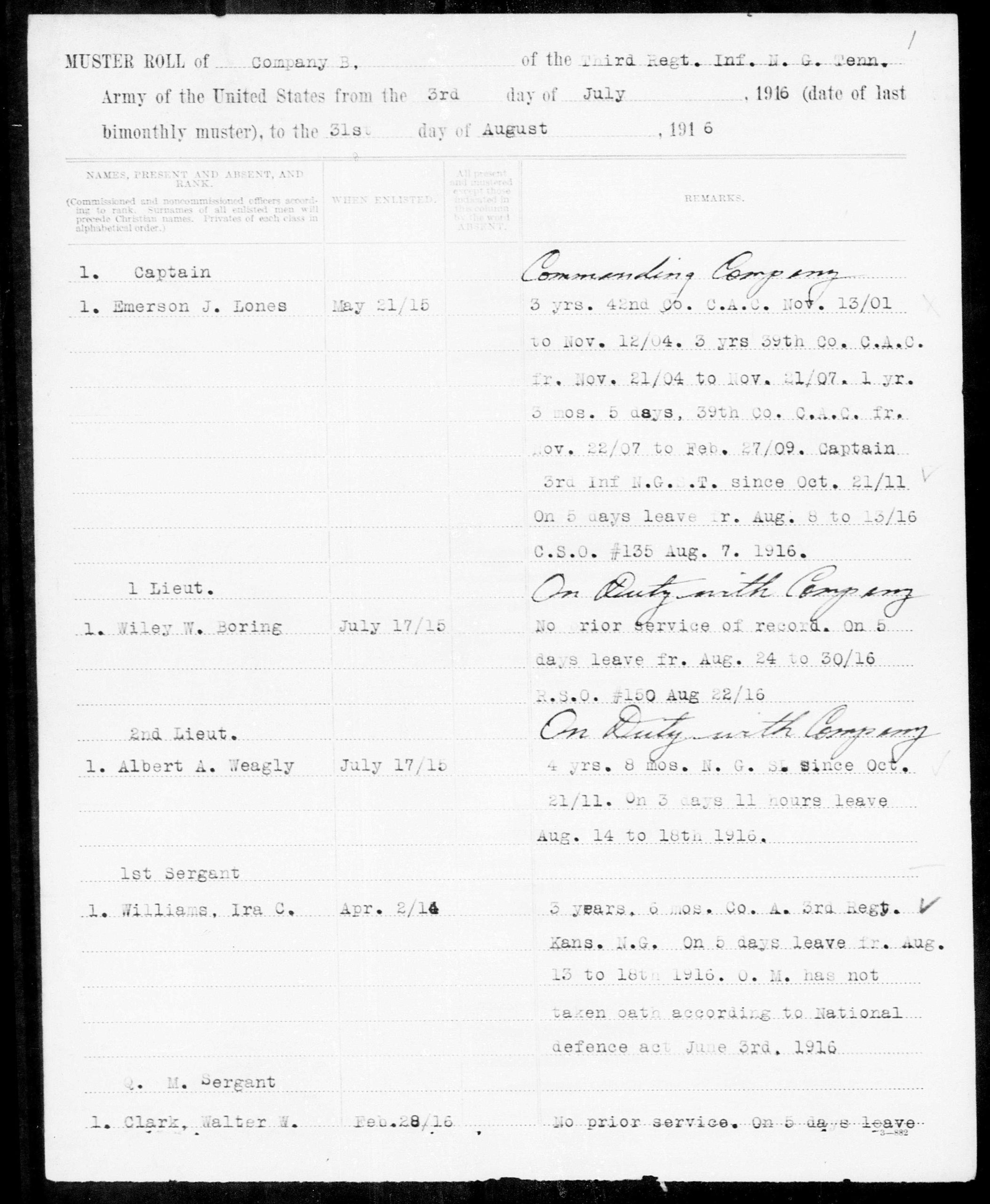 Captain E.J. Lones has been in the fighting service of the nation for seventeen years. In 1901 he entered the regular army, remaining there till 1907. From private he progressed to corporal, then sergeant and quartermaster sergeant, then first sergeant and expert gunner in the coast artillery. Returning to civil life he organized Company B of the old Third Infantry of Tennessee, and was commissioned captain in October 1911. His commission was signed by Gov. Ben Hooper. As captain of the company he built up an organization that ranked first in the state camps and inspections. Captain Lones sacrified much time and money, and devoted a great deal of energy to making the company what it was. When the government needed troops on the Mexican border in 1915, Company B was mustered into the federal service, and headed by Captain Lones served along the border at various points. It was only a short time after the troops returned from the border that the call for service against Germany was made and Captain Lones and his faithful men responded as volunteers. After drilling in Maryville for serveral weeks, they were called to Camp Sevier, and thence to Europe.