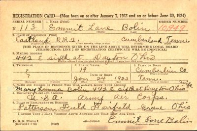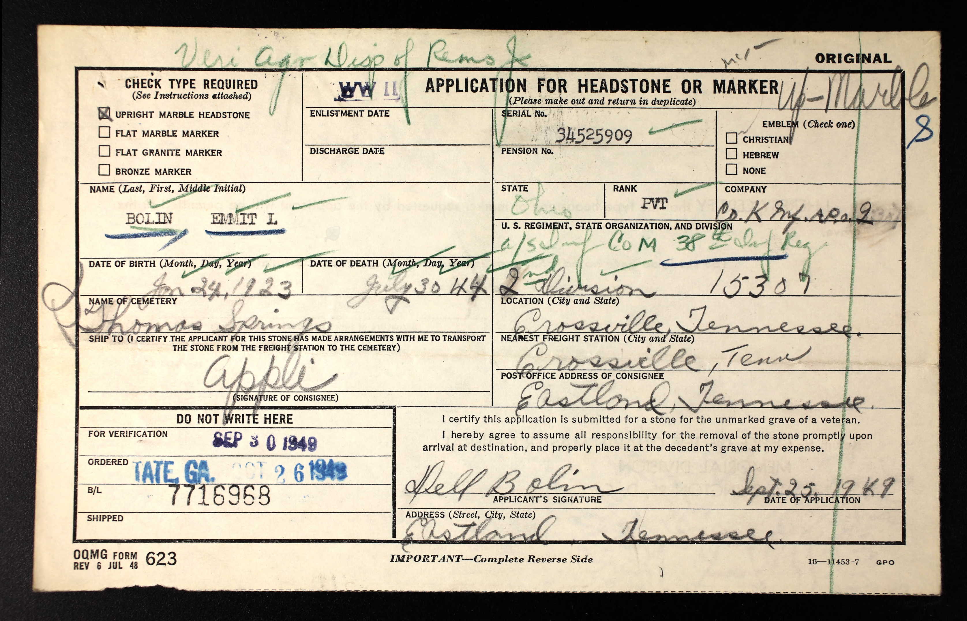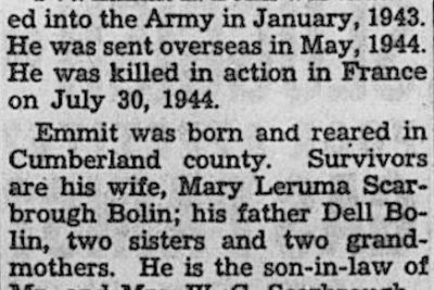 Pvt. Emmit L. Bolins was inducted into the Army in January, 1943. He was sent overseas in May, 1944. He was killed in action in France on July 30, 1944. Emmit was born and reared in Cumberland County. Survivors are his wife, Mary Leruma Scarbrough Bolin; his father Dell Bolin, two sisters and two grandmothers. He is the son-in-law of Mr. and Mrs. W.C. Scarbrough