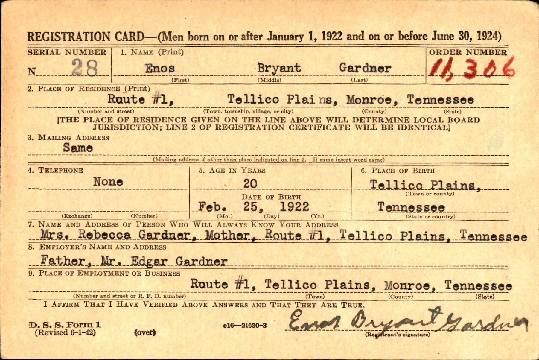 Enos Bryant Gardner was born February 25, 1922 in Monroe County, Tennessee. He was the son of Edgar Gardner and Rebecca Spurling Gardner.